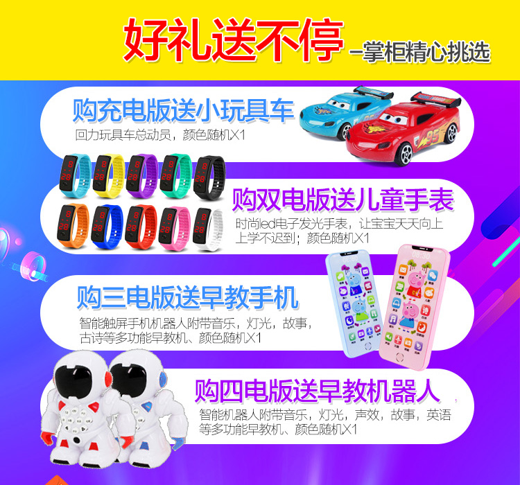 1 large lithium battery life of 45 minutes + USB charging (collection plus purchase to send small toy car) 2 large lithium battery life of 90 minutes + USB charging (collection plus purchase to send children's watches) 3 large lithium battery life of 135 minutes + USB charging (collection plus purchase to send early education mobile phone) 4 large lithium battery life 180 minutes + USB charging (collection plus purchase to send early education robot)