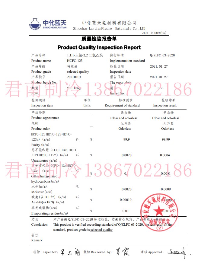 Original Sinochem Blue Sky Refrigerant Refrigerant Refrigerant Freon R123 (Net Weight 100KG Provide Quality Inspection List