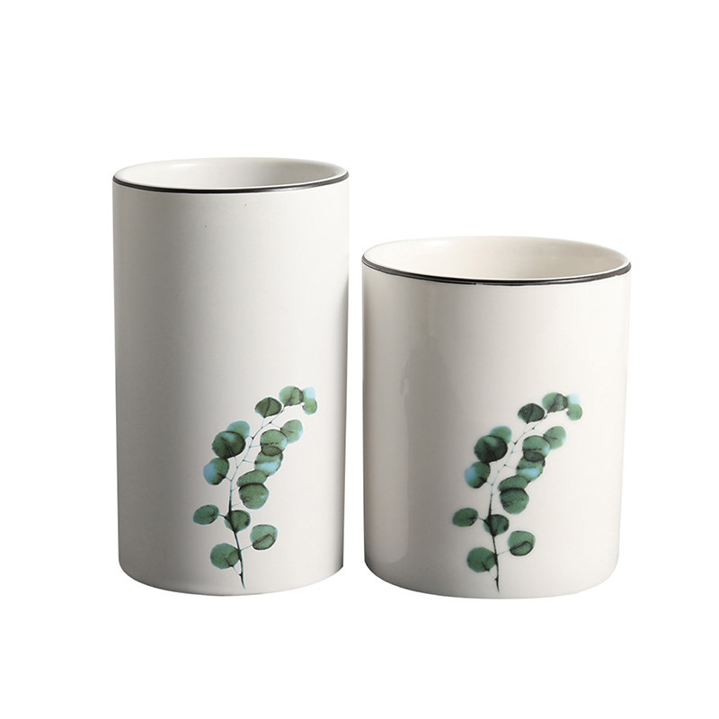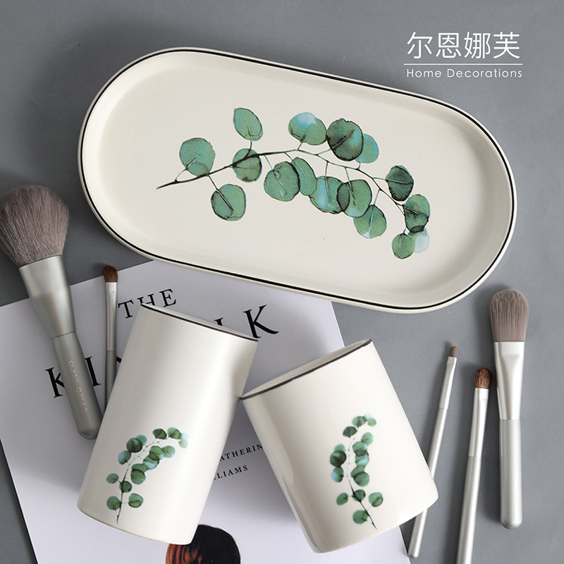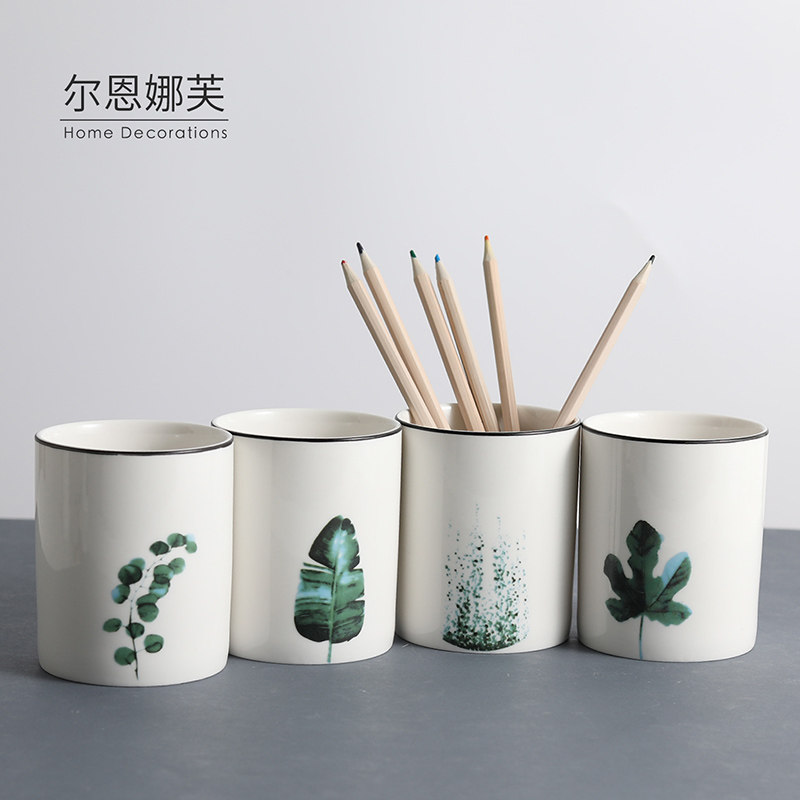 Nordic Green Plant Small Fresh Pen Holder Barrel Ceramic Makeup Brush Drum Makeup Brush Barrel Tabletop Eyelachline Pen Brow Pen Holder