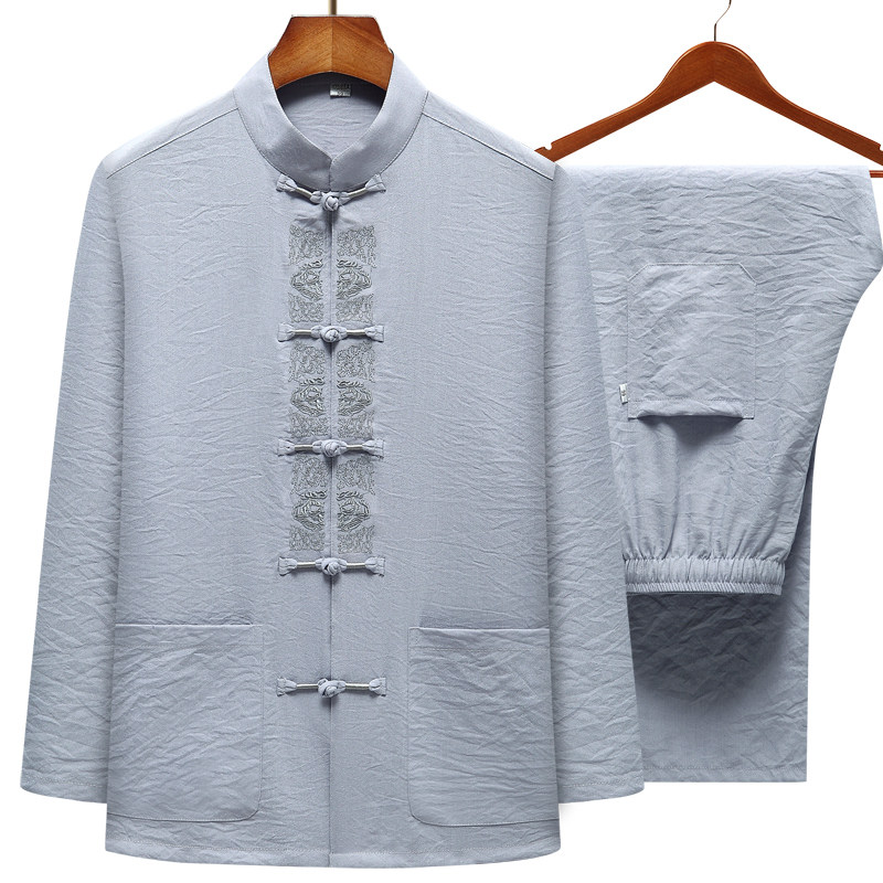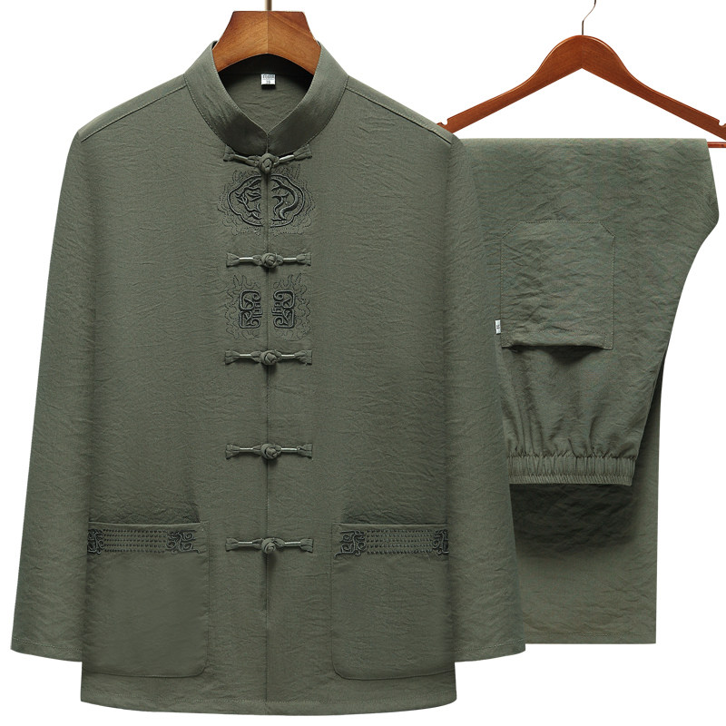 Middle-aged and elderly cotton and linen Tang suit long-sleeved men's suit spring and autumn grandpa Chinese style linen buckle loose large size dad's suit