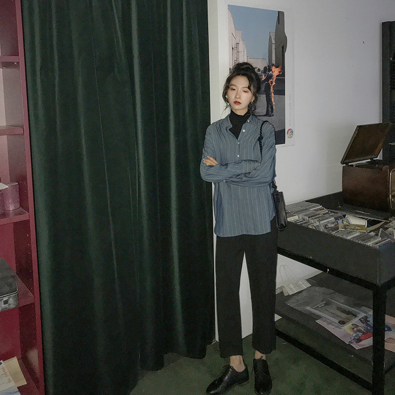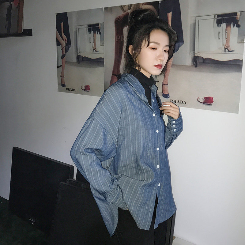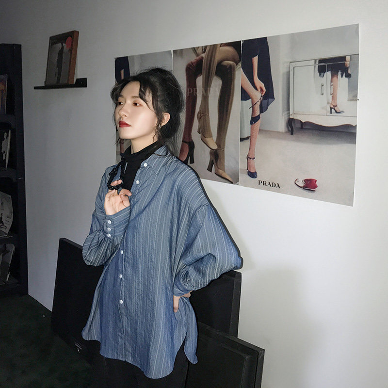 Luminous #Make your own blue friend #Vintage Hong Kong flavor loose long sleeve shirt women's mid-length striped cufflink shirt