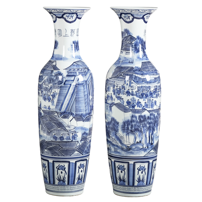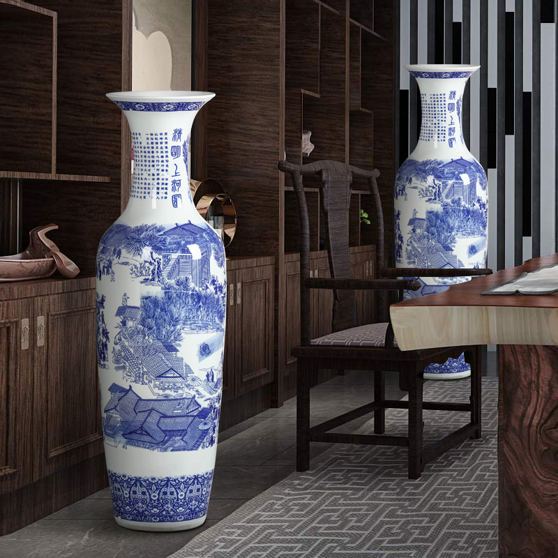 Jingdezhen ceramic floor-to-ceiling large vase antique blue and white porcelain Qingming Shanghe map living room high ornaments hotel decorations