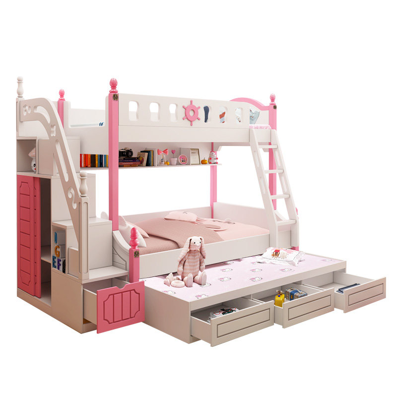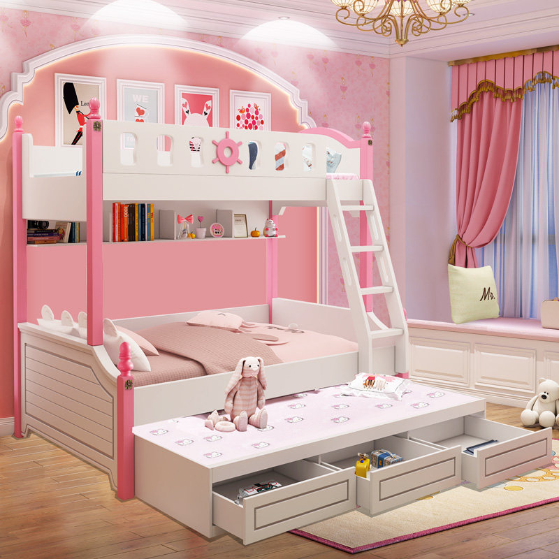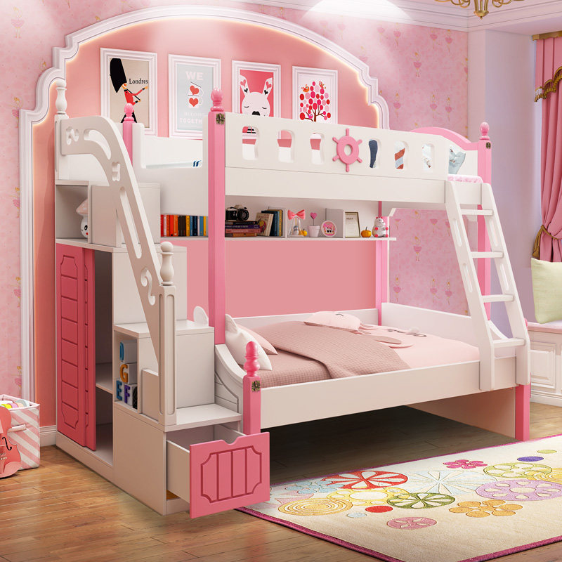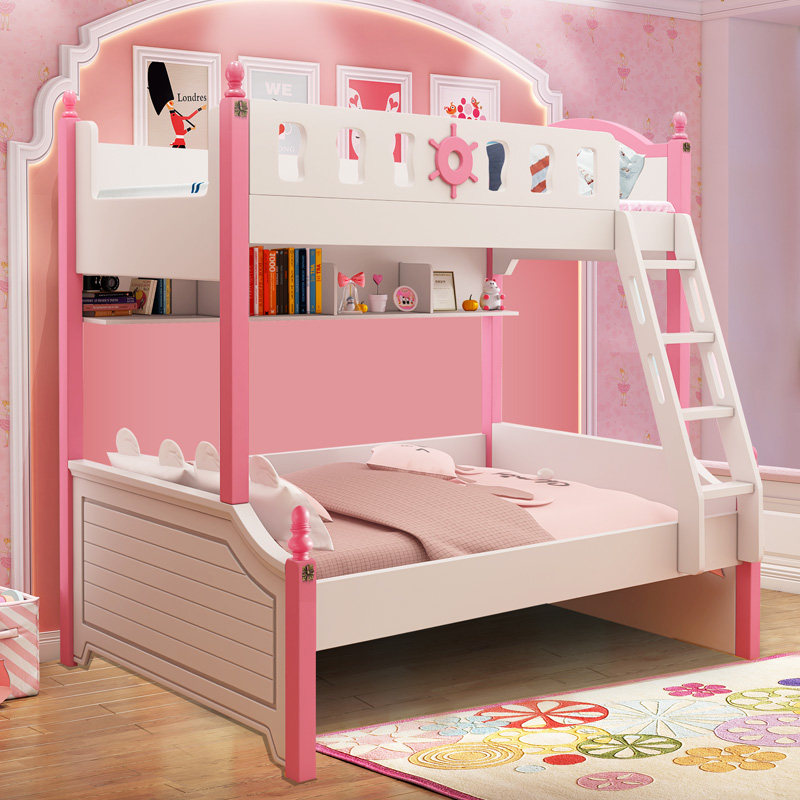 High and low bed pink bunk bed solid wood upper and lower bed multifunctional combined bed space saving sub-mother bed two-layer bed slide