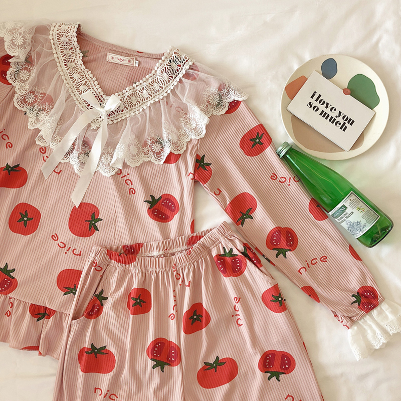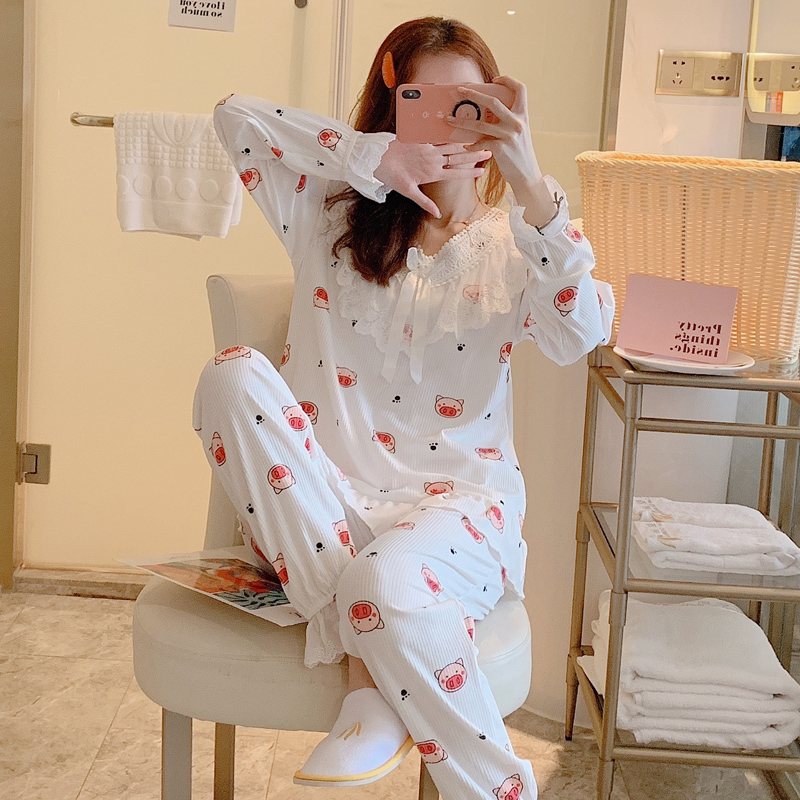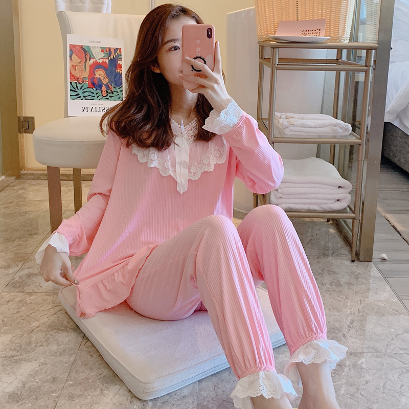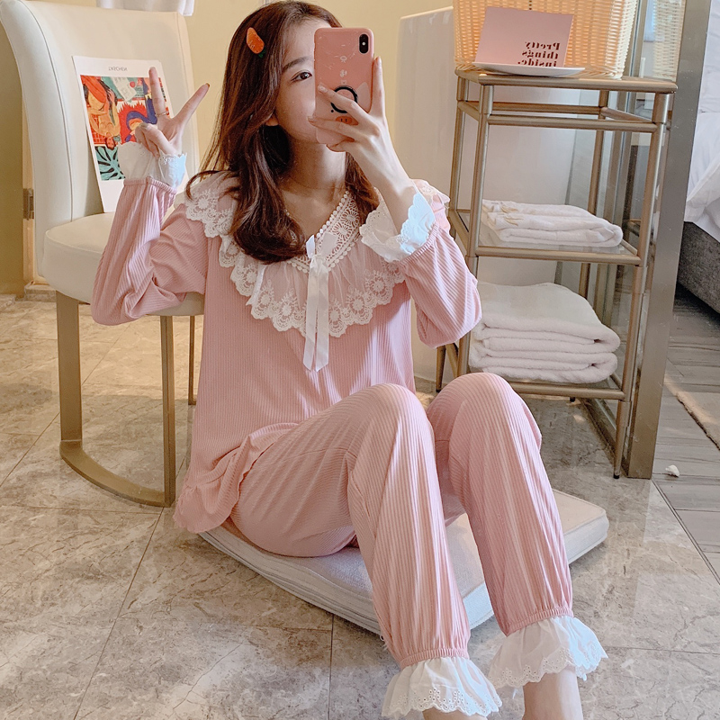 Long sleeve pyjamas women's spring and autumn suit Two sets of Korean version Students cute lace princess Winners' home in autumn and winter thin style-Taobao