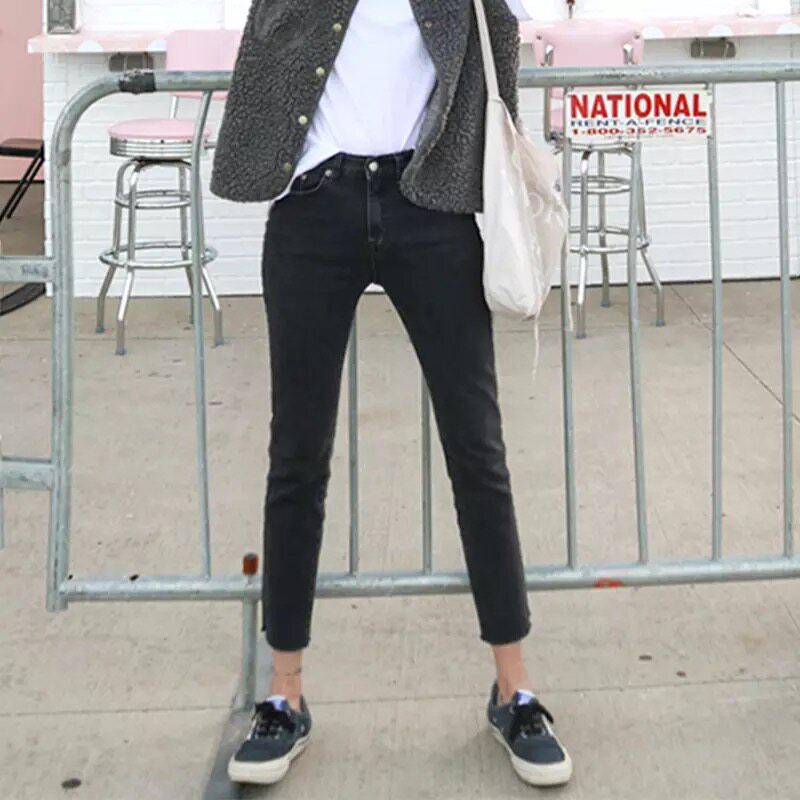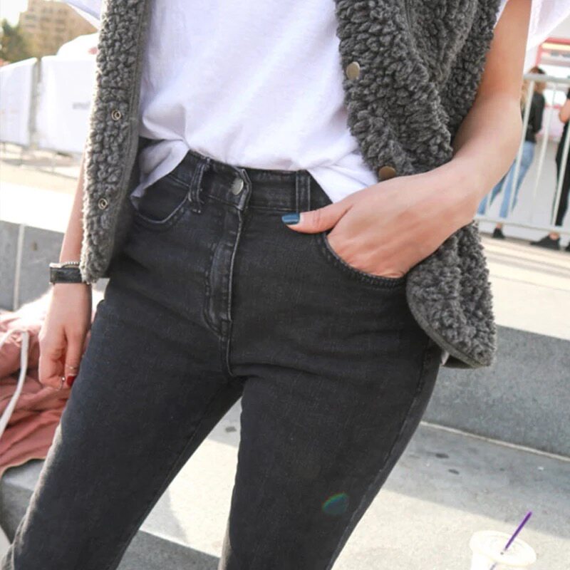 Korean Smoking Grey Jeans Women 90% Pants 2021 Autumn Winter Plus Suede Black elastic Conspiculy High Waist Small Straight Drum Pants