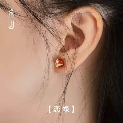 See the mountain) love Butterfly) natural amber National Wind ear needle ring female S925 sterling silver temperament Chinese retro butterfly ear ornaments