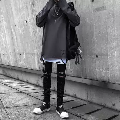 High Street knee broken jeans men scraped black tide hip hop embroidery elastic slim feet hip hop beggar pants