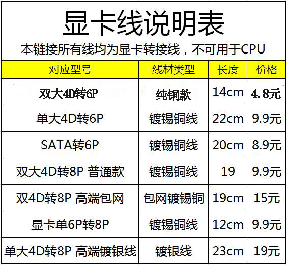 Dual large 4P to 6P single large 4P to 6P dual large 4P to 6P dual 4P to 8P dual 4D to 8P high-end package graphics card single 6P to 8P single large 4D to 8P high-end plating