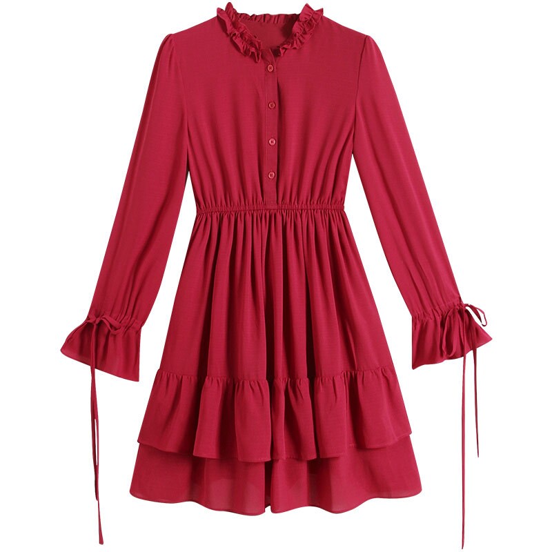 European Station 2023 New Chip Dress Woman Han Edition Lady Single - row Closed Long - sleeved Load Leaf Dress
