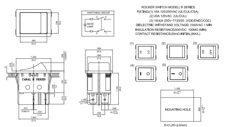 Taiwan imported CANAL original rocker switch R210-1-C5L-BR four-foot red light rocker switch