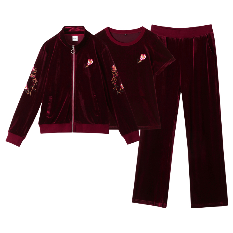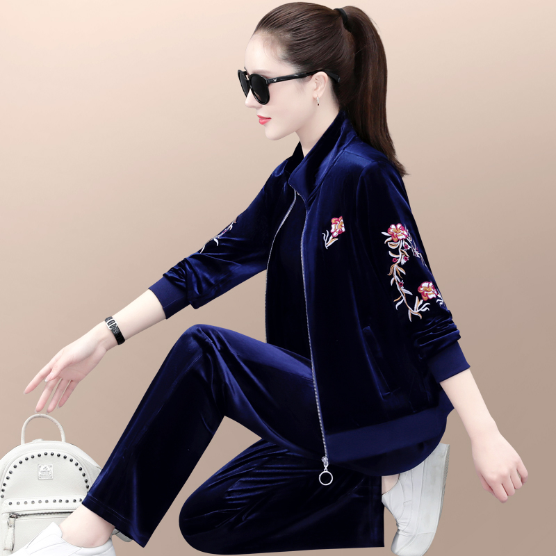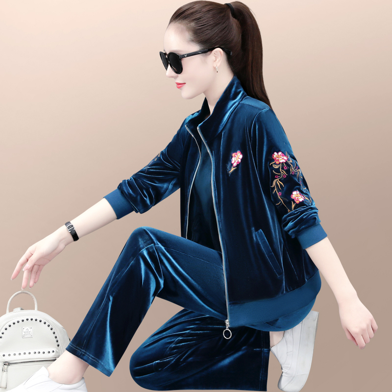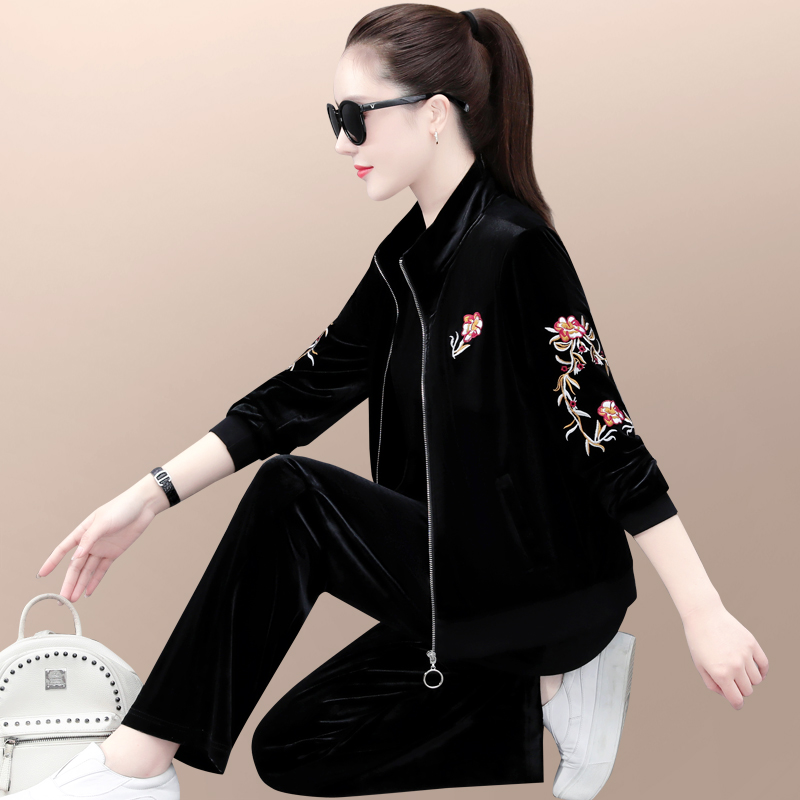 Golden Velvet Sports Suit Woman Spring Autumn 2022 New Fashion Upright Collar Loose Large Size Casual Wear and Slim Three Sets
