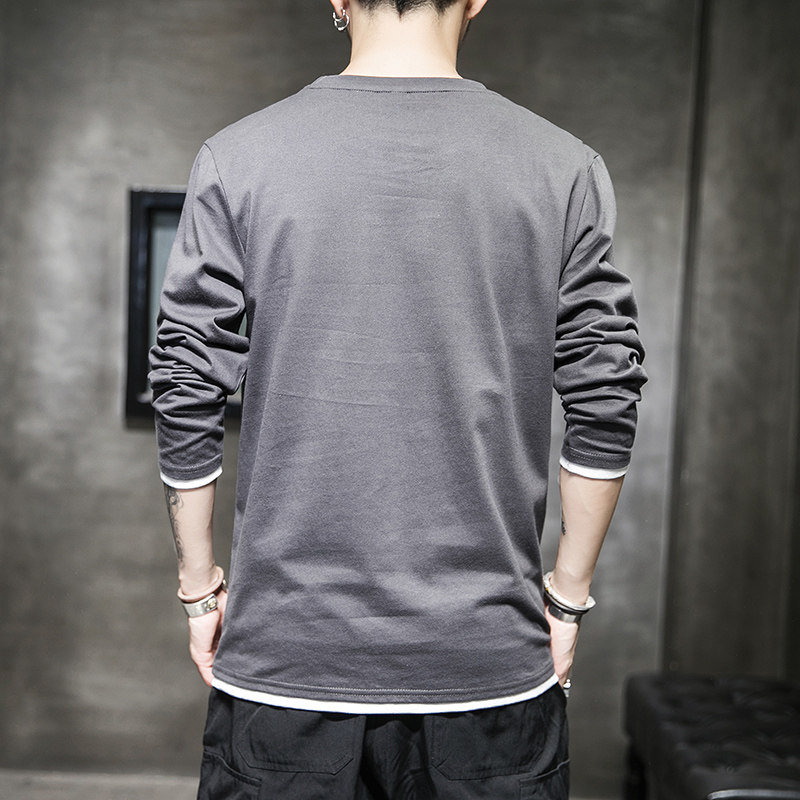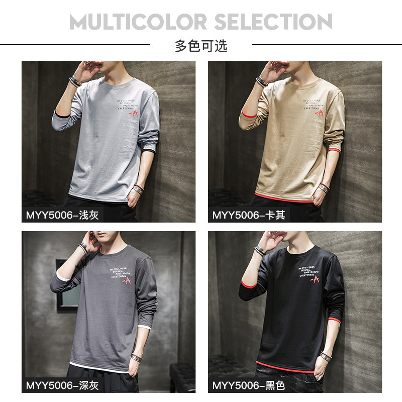 2021 new autumn long-sleeved T-shirt men's Korean version of the trend loose casual port wind men's printed fake two-piece top