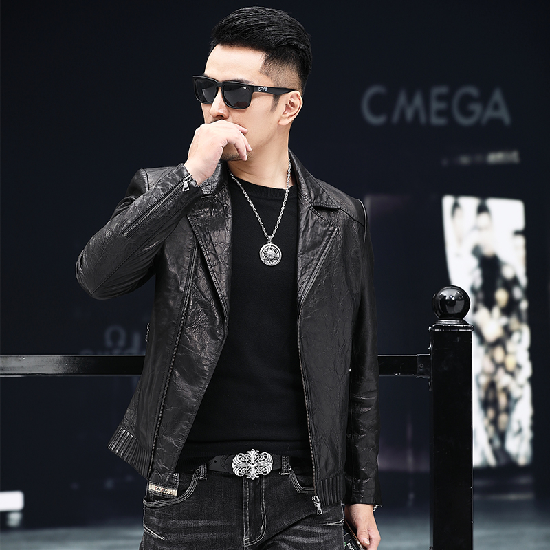 2021 autumn and winter new Haining leather leather men's goatskin short motorcycle leather jacket handsome slim jacket trend