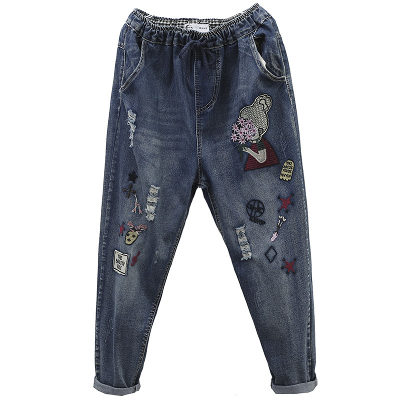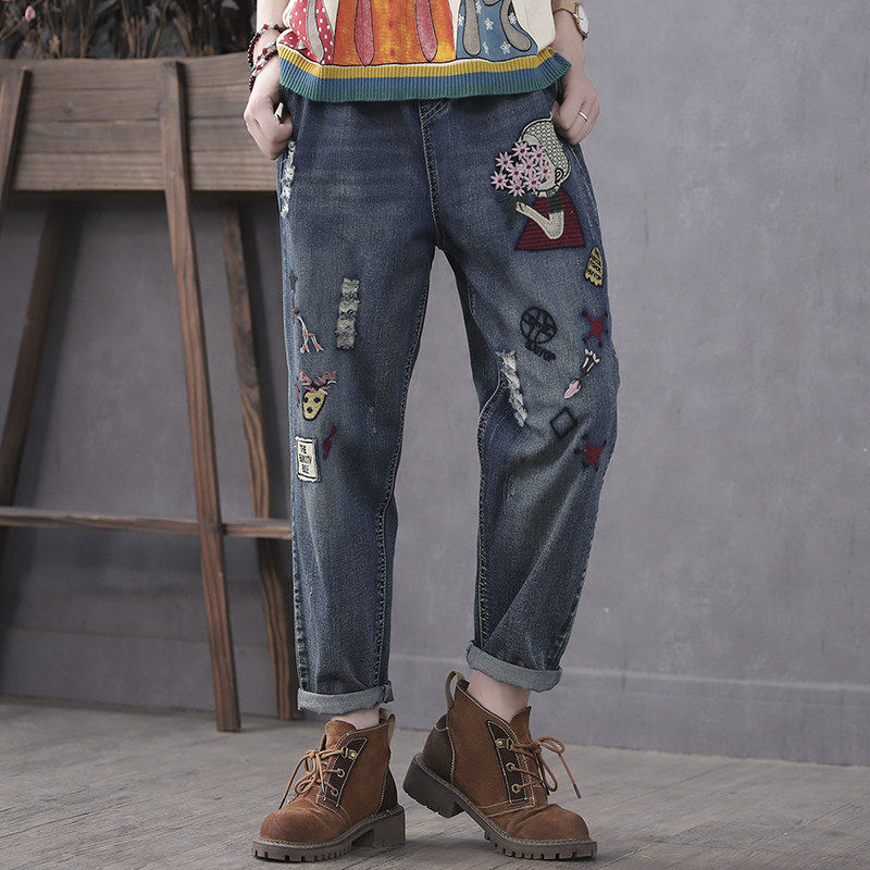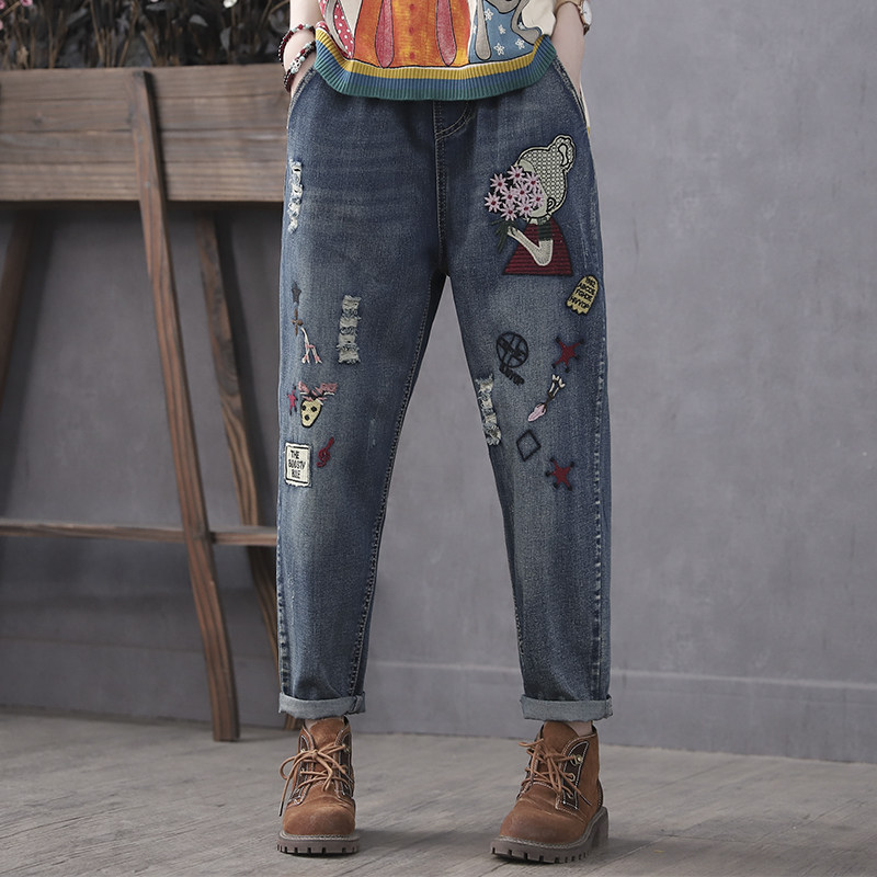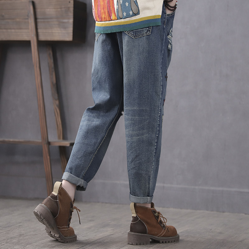 Han Suoyi retro literary autumn new jeans women loose nine-point pants high waist embroidered Harun cigarette tube pants