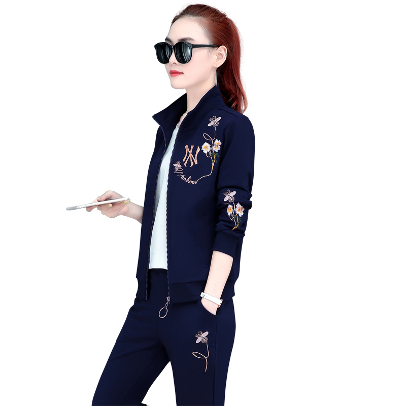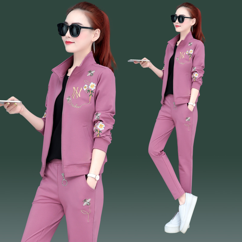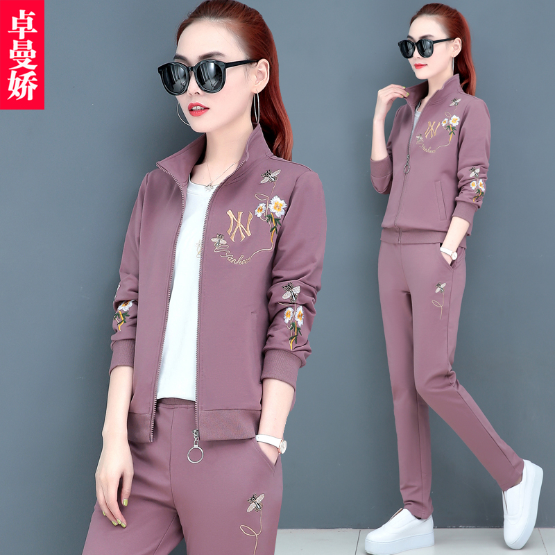 Casual sports suit women's spring and Autumn 2020 new fashion embroidered stand-up collar large size foreign school Korean version loose three-piece set
