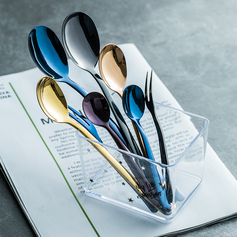 Fruit fork (golden) Fruit fork (purple) Fruit fork (rose gold) Fruit fork (blue) Fruit fork (black) Fruit fork (silver) Coffee spoon (gold) Coffee spoon (purple) Coffee spoon