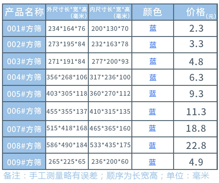 001#方筛(234 * 164 * 76) Blue 002#方筛(273 * 195 * 84) Blue 003#方筛(320 * 240 * 98) Blue 004