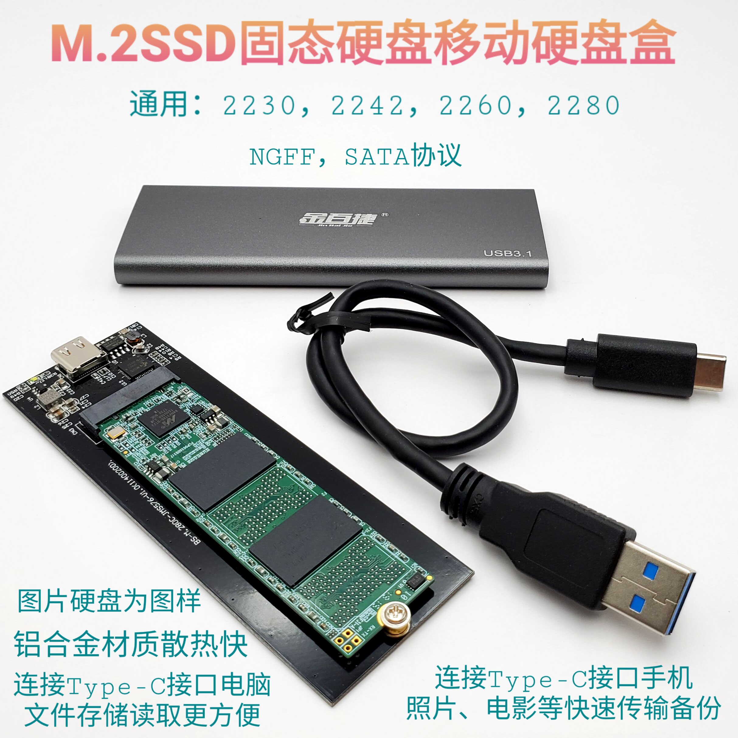 Jinbaijie m2 hard disk box NGFF to usb3 1 typec SATA 2280 high speed m2 solid state ssd box