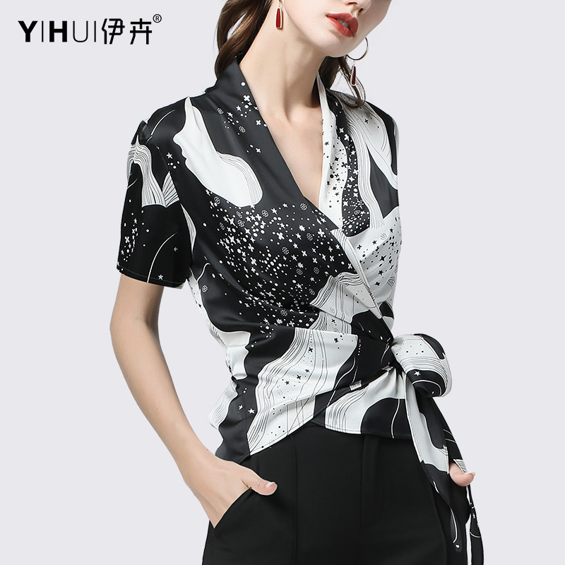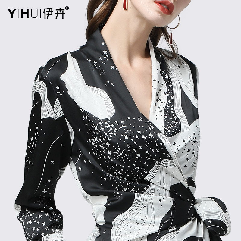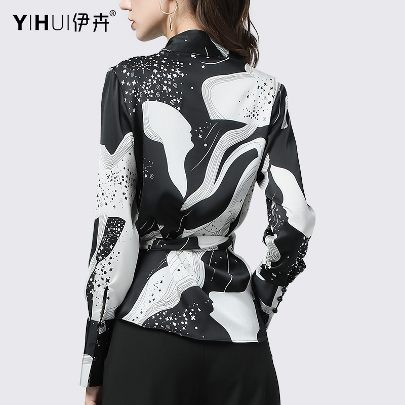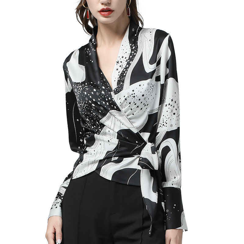 Spring 2021 new chiffon shirt long-sleeved top women's V-neck waist satin shirt slim-fit shirt thin Western style