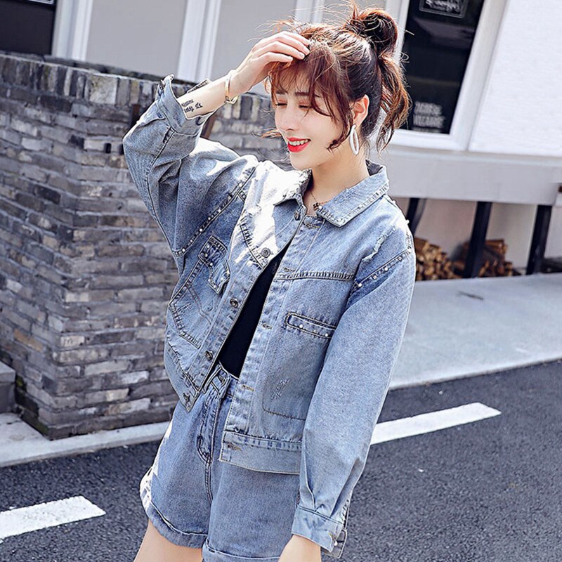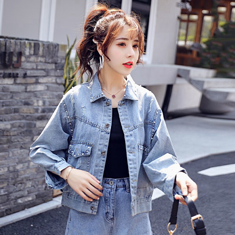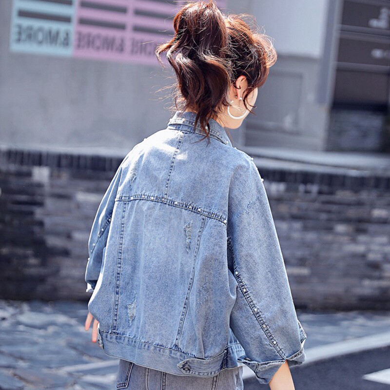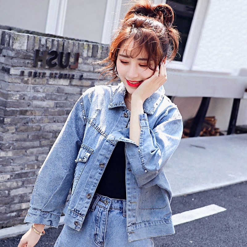Nail Beaded Denim Jacket Woman Spring Autumn 2022 New Ins Tide Korean Version Loose short and small sub light color blouses