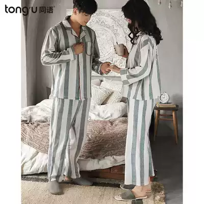 Same language 2019 couple pajamas spring and autumn cotton long sleeve stripes simple set autumn casual men and women's home clothes