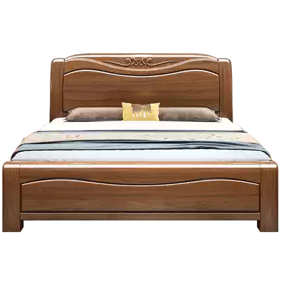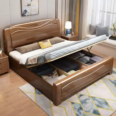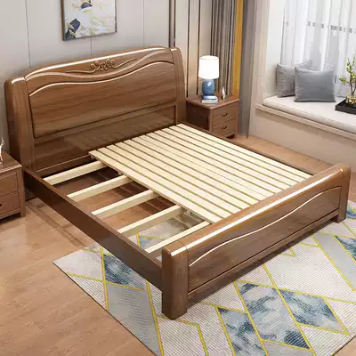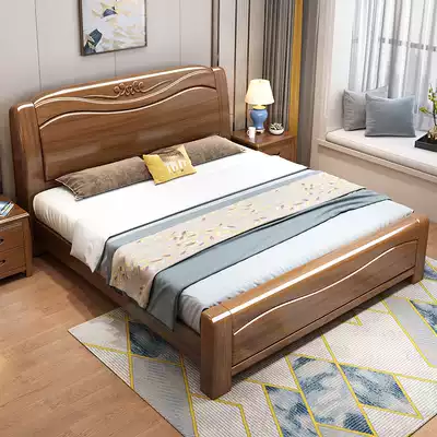 Golden silk walnut carved solid wood bed double bed 1 8 meters 1 5M modern simple master bedroom Chinese storage wedding bed