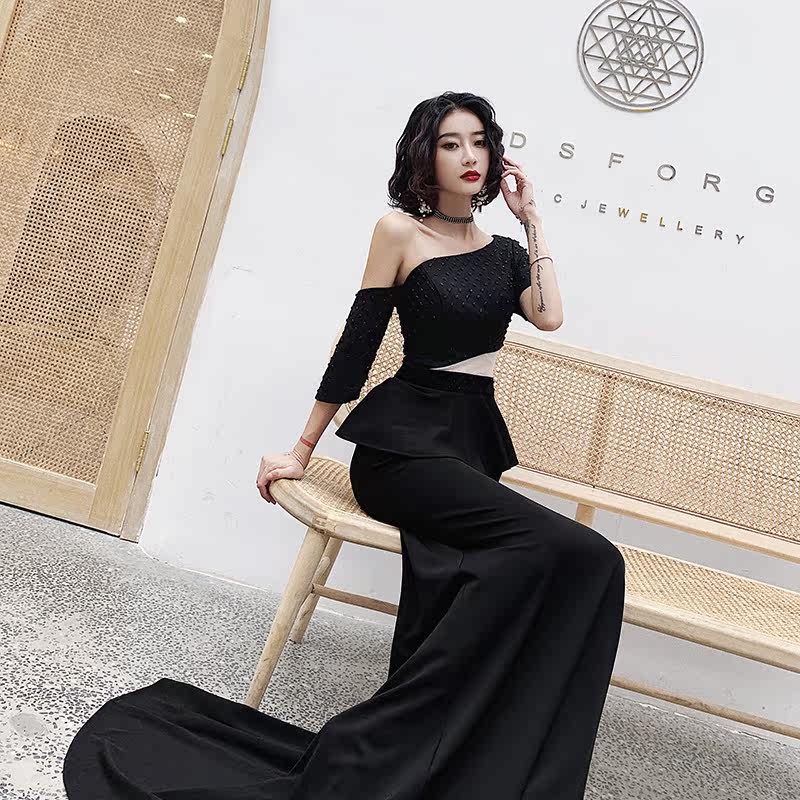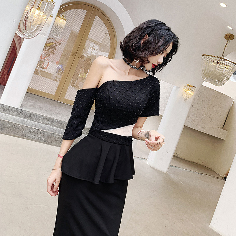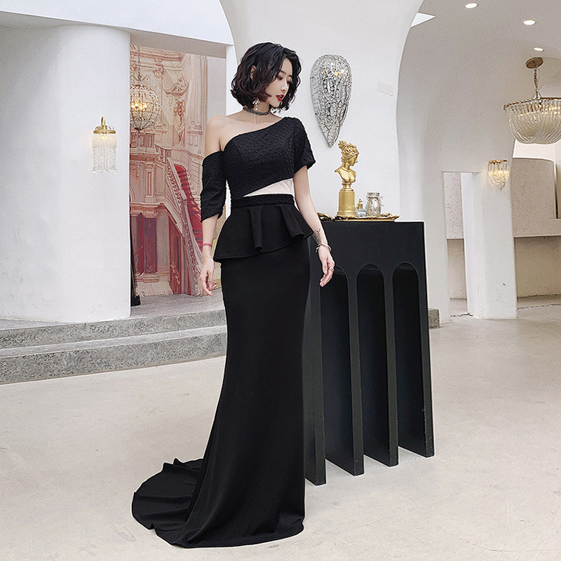 Evening dress female 2020 new banquet noble temperament one shoulder long black show thin annual meeting host dress dress
