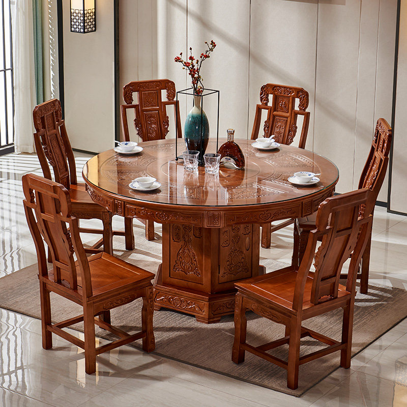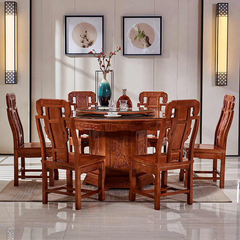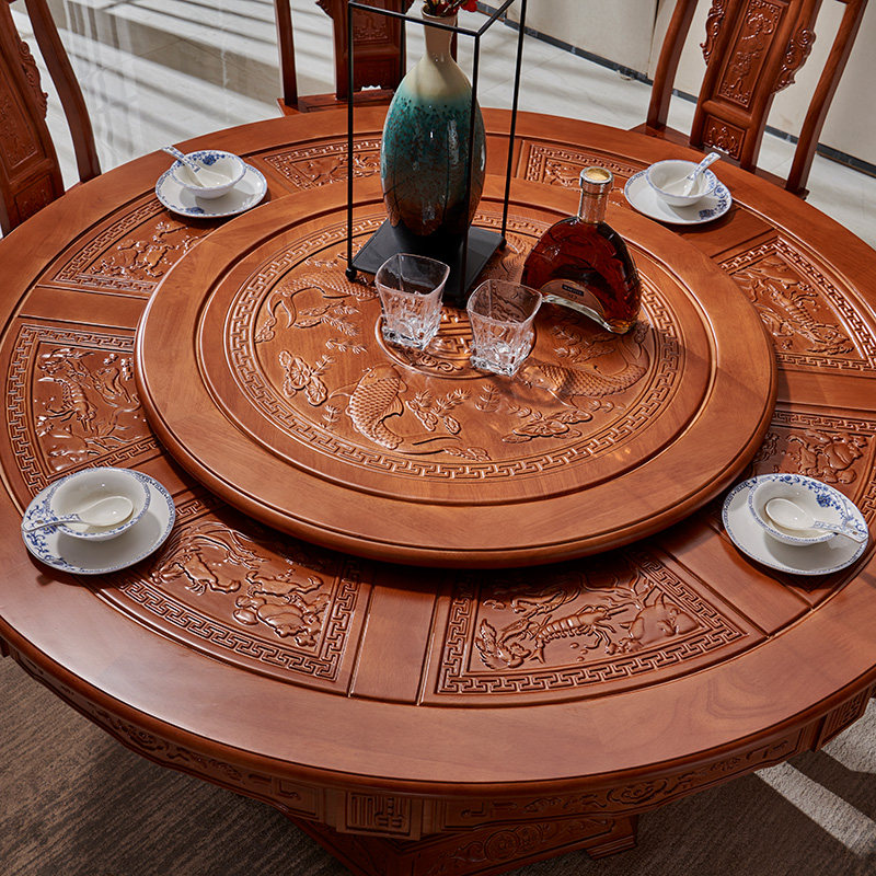 New Chinese style all solid wood dining table Ming and Qing classical carved large round table and chair combination with turntable 6-10 people's dining table