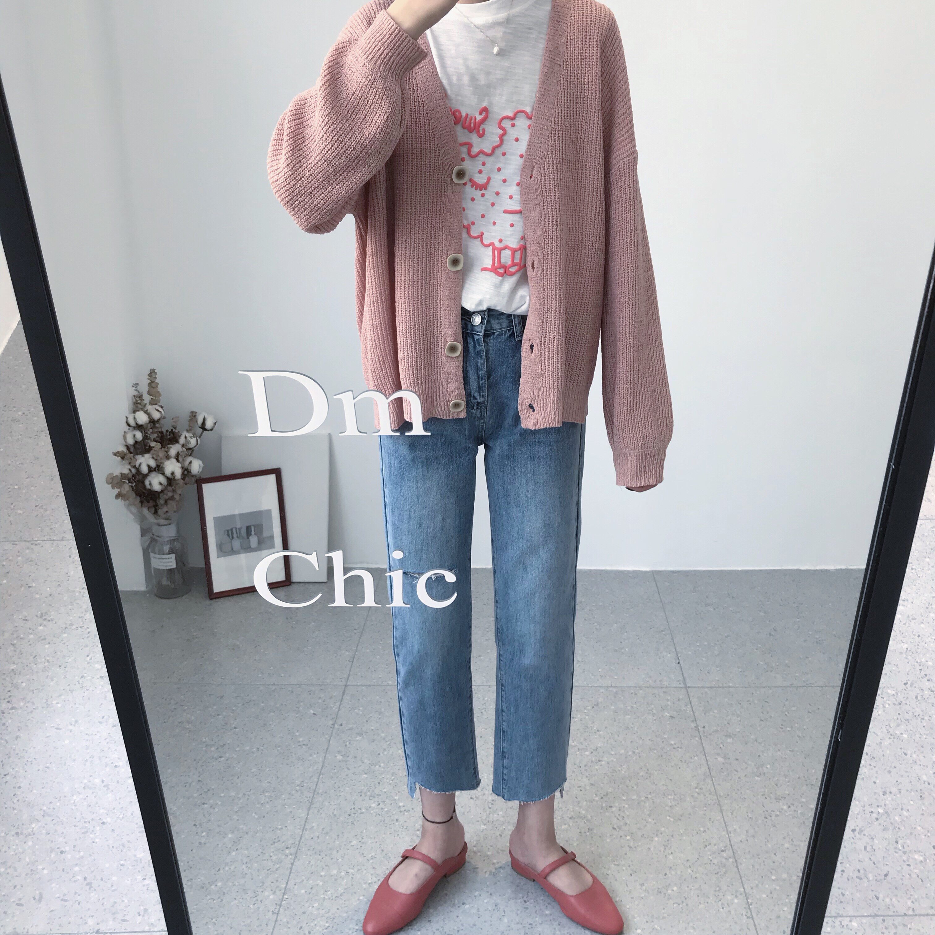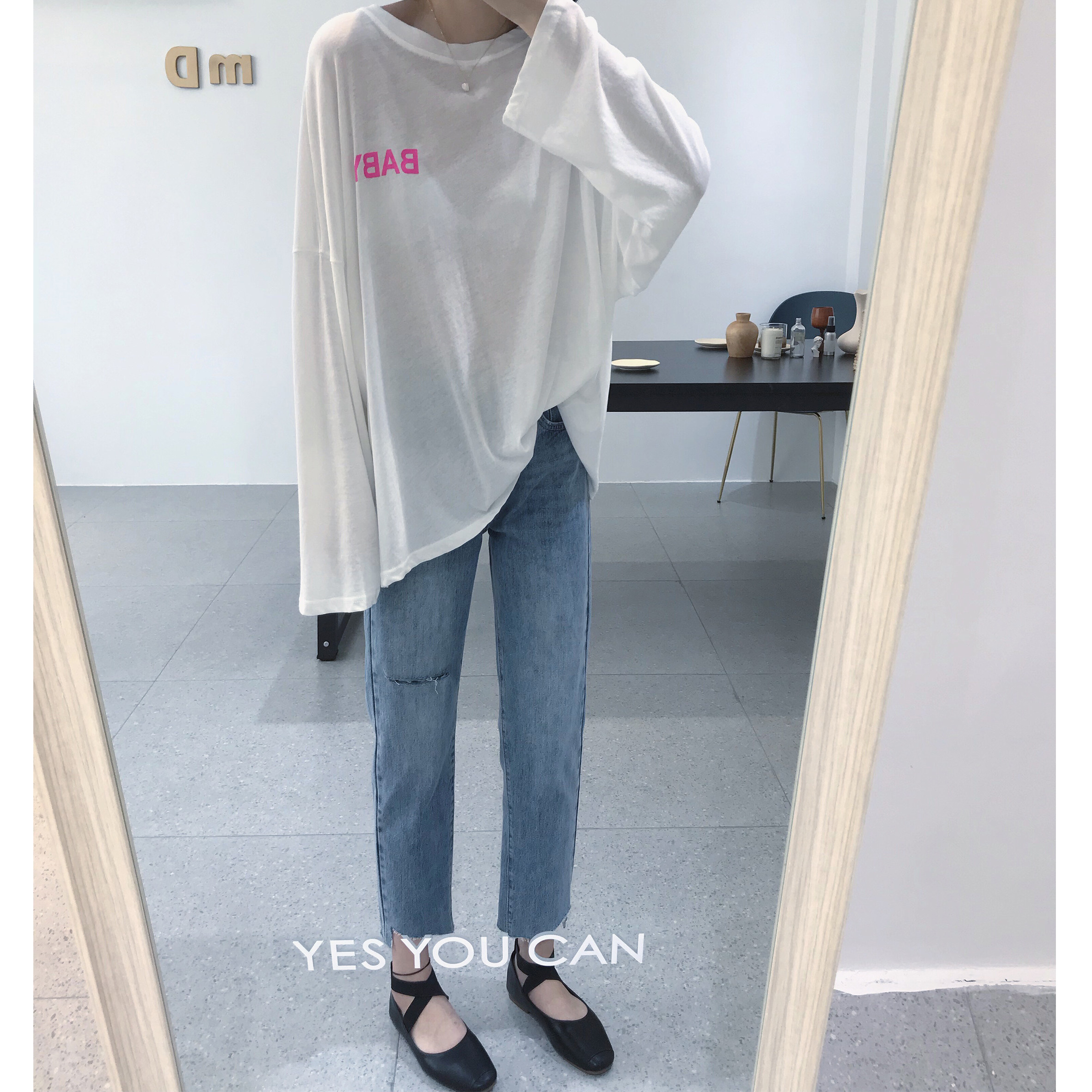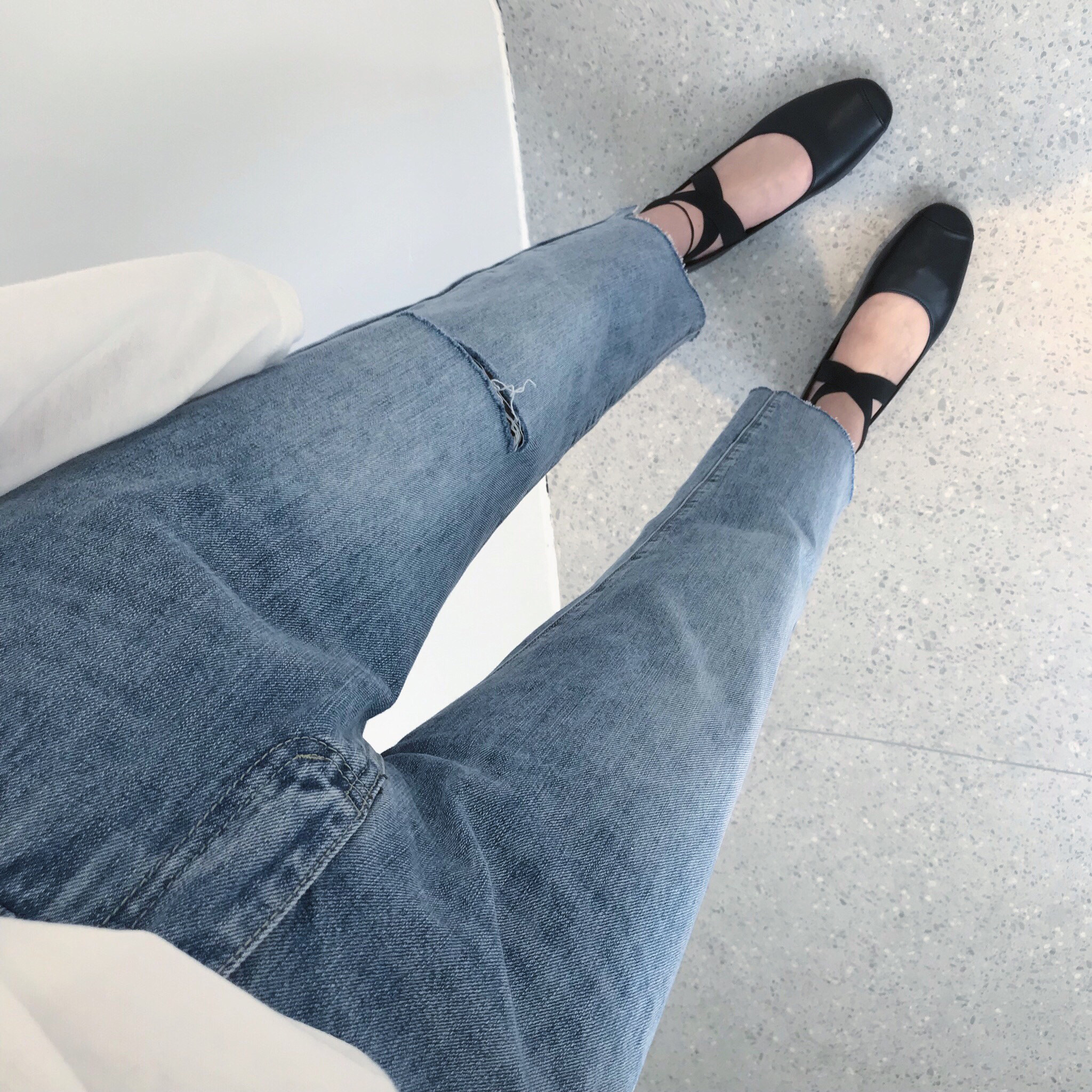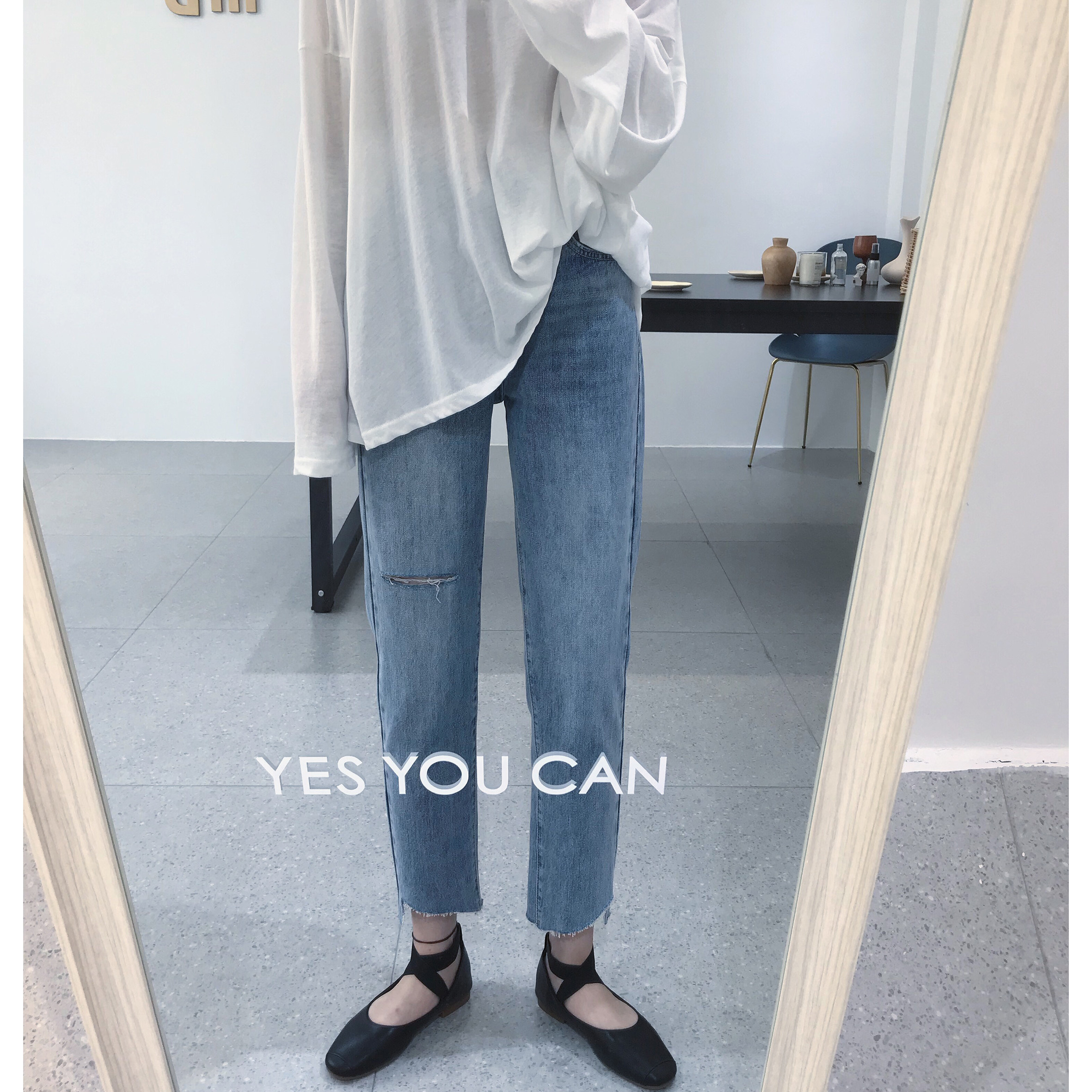 Dameng early autumn new transition style Western style nine points comfortable light blue hole casual cut edge jeans women