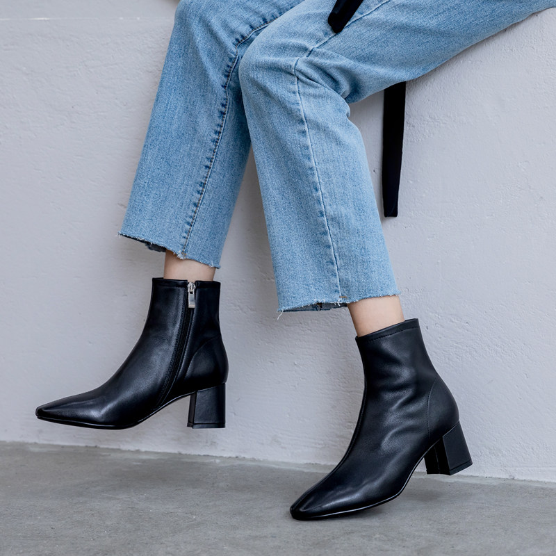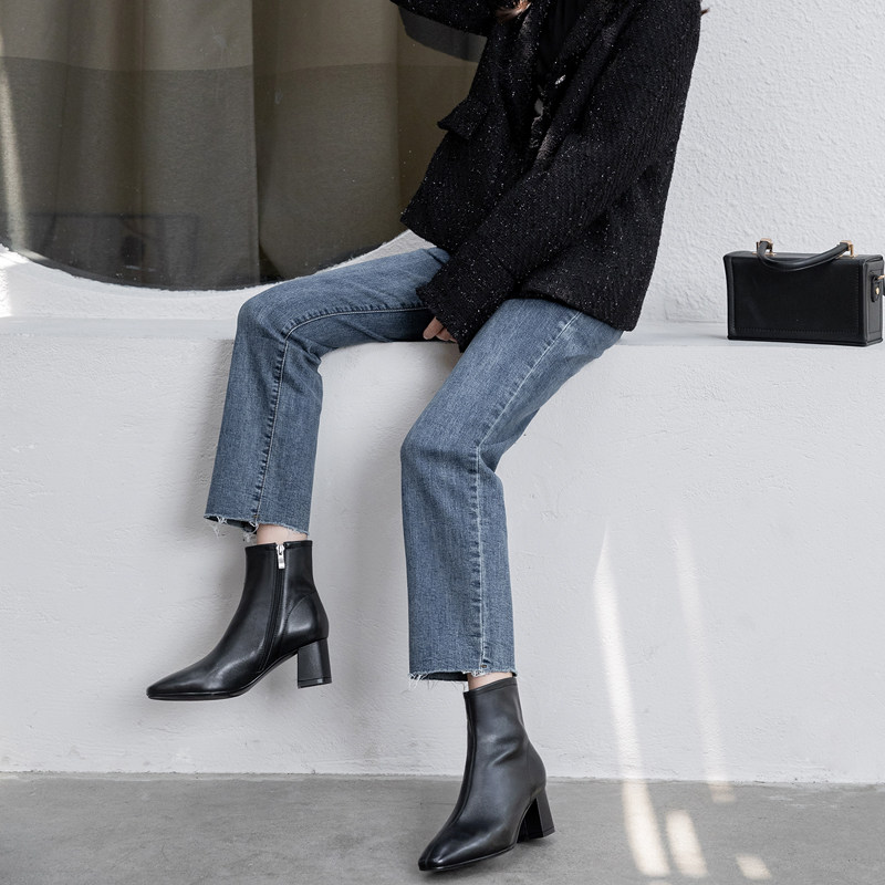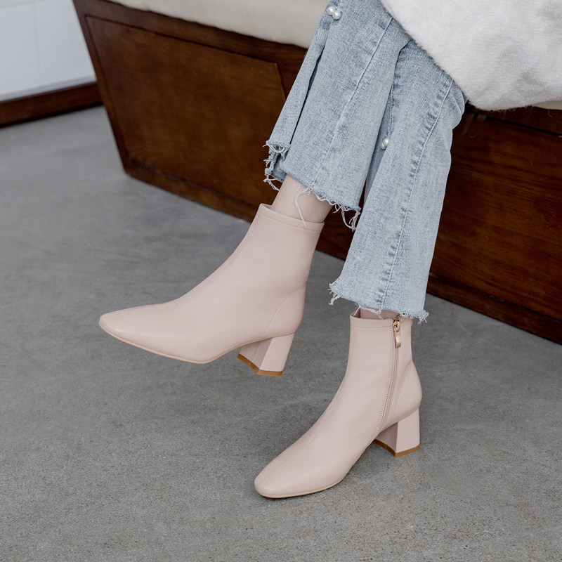 2021 new genuine leather short boots female spring autumn single boot white square head single boot coarse heel Martin boots with small and half boots