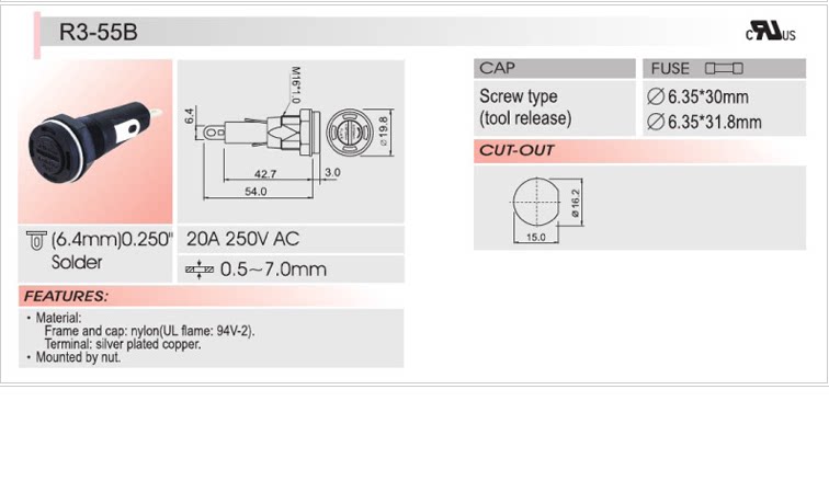 Taiwan SCI screw type imported fuse holder R3-55B 6*30mm glass tube holder 20A 250V