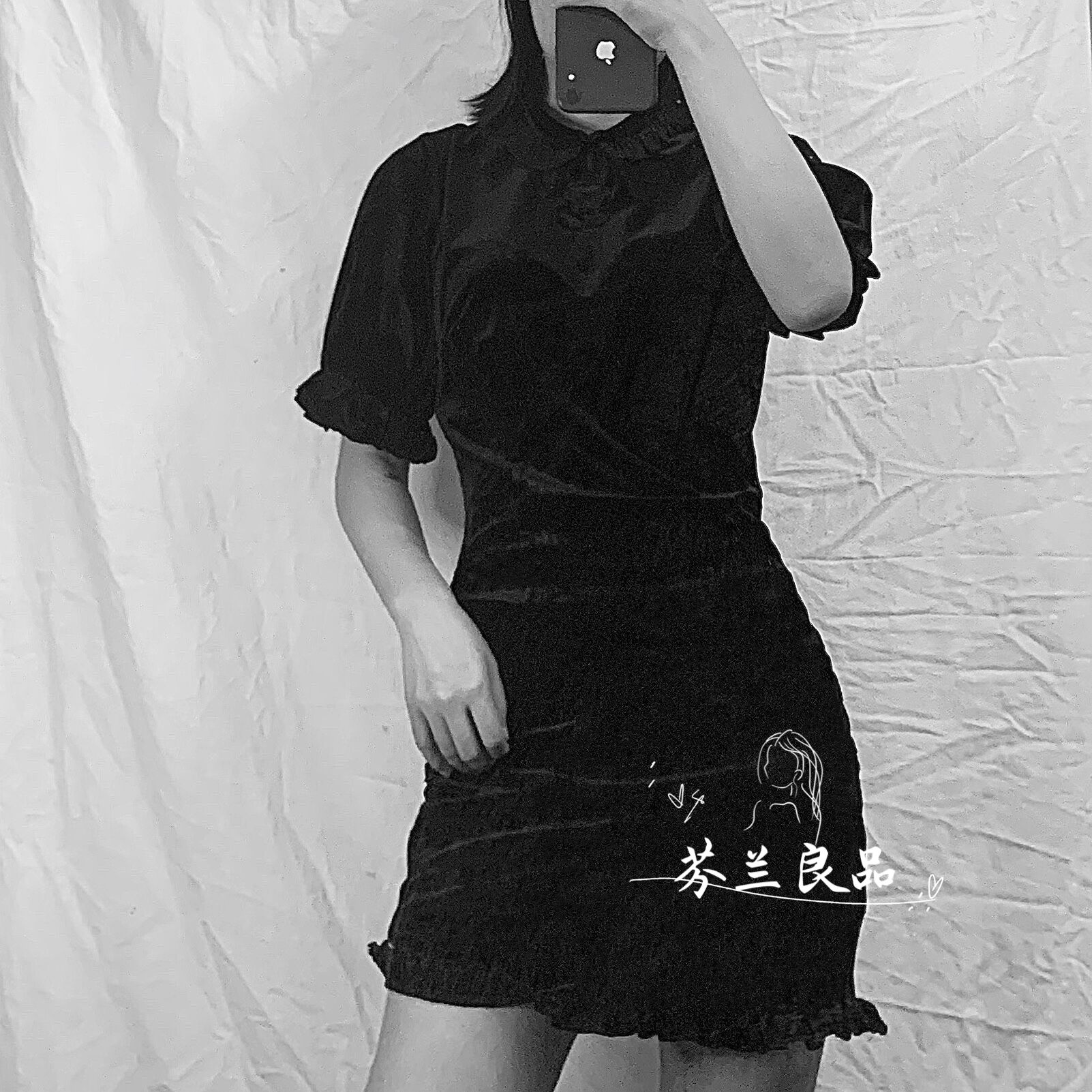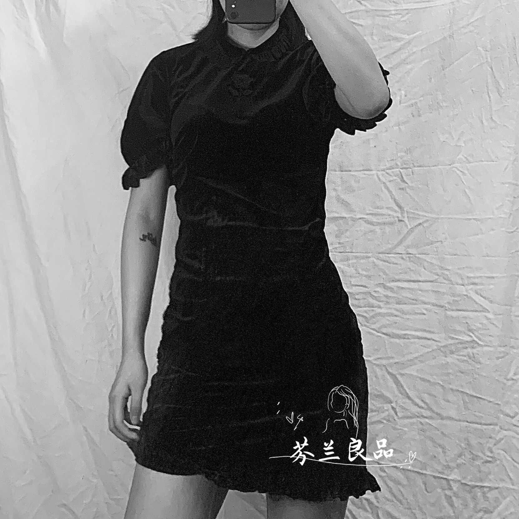 Spot original improved dark girl gothic rose navy collar velvet lantern sleeve cheongsam