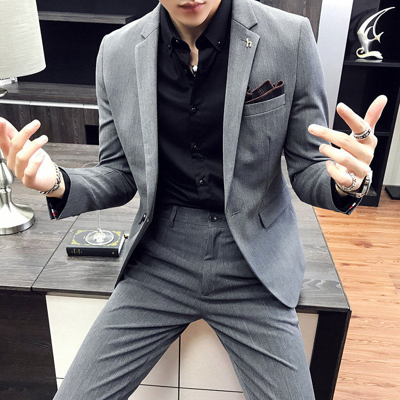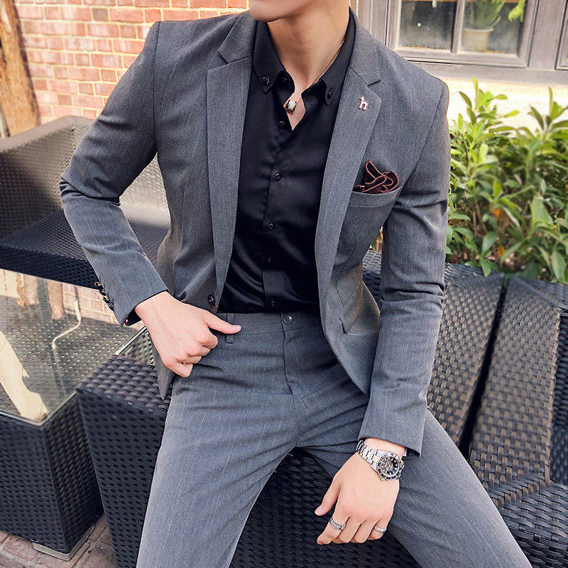 Medium gray (single suit) dark gray (single suit) medium gray (suit pants) dark gray (suit pants) medium gray (suit pants) white shirt) dark gray (suit pants)
