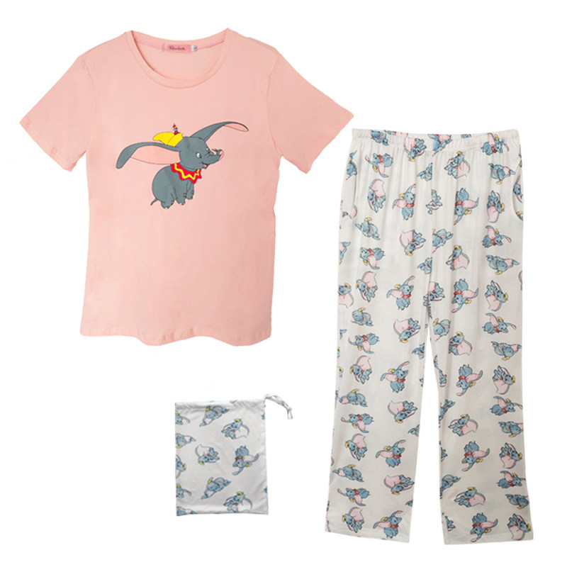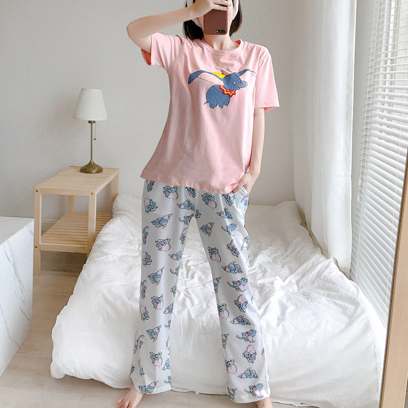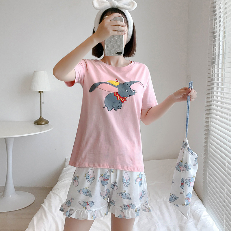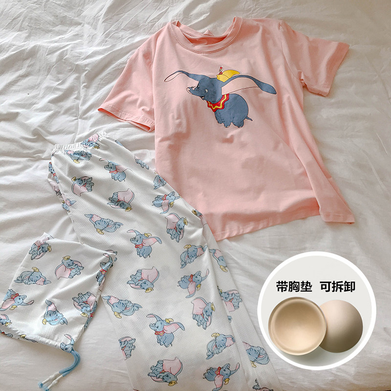 Korean Version Cartoon Small Flying Elephant Pure Cotton Short Sleeves Shorts Pyjamas Pants Sets Women's Summer With Chest Cushion Long Pants Casual Home Wear