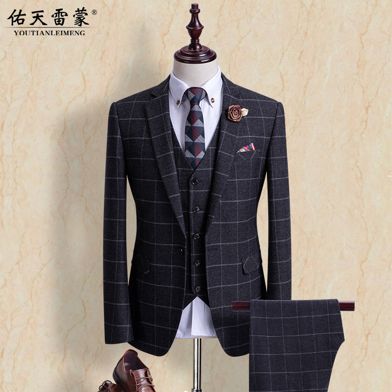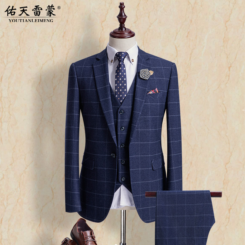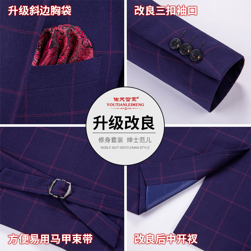 Groom suit suit Men's three-piece suit Korean version wedding dress slim dress Plaid suit men's summer thin section