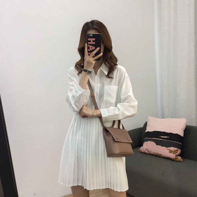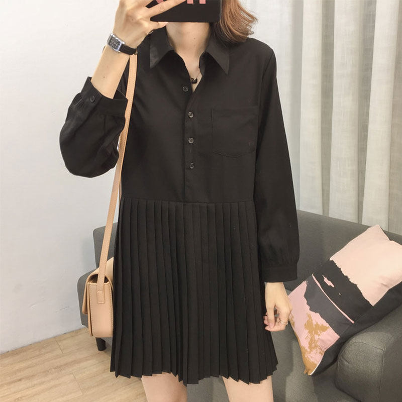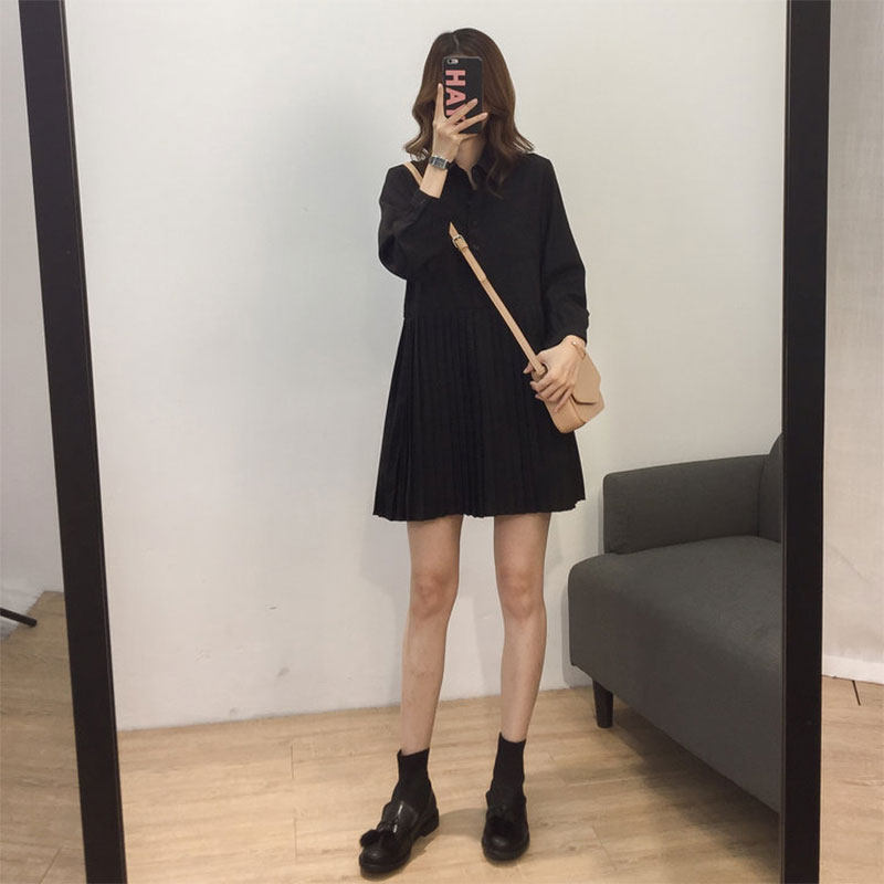 Women's Spring 2020 New Shirt Dress Medium Long Edition French Retro Black Skirt Long Sleeve Dress Children Spring and Autumn