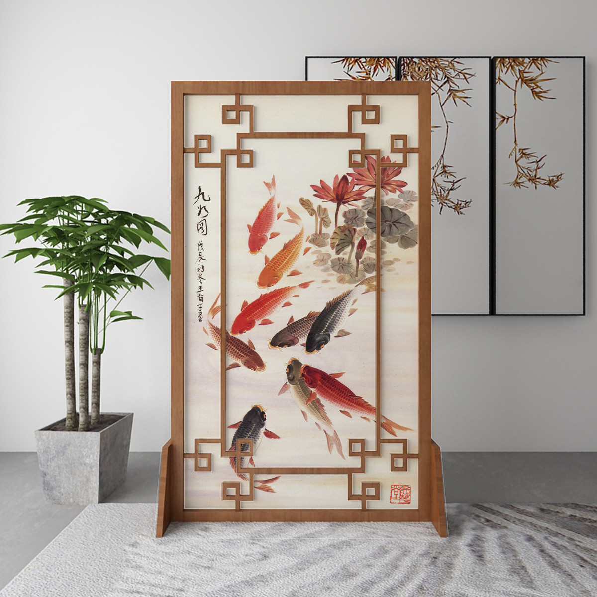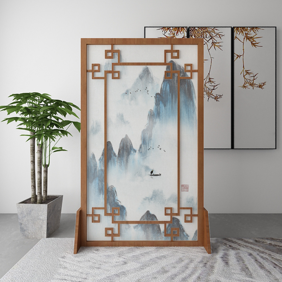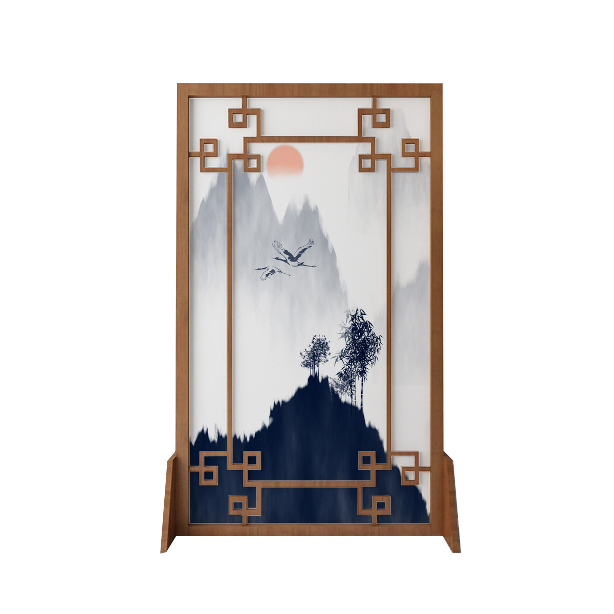 Modern New Chinese Screen Screen Partition Xuanguan Living Room Hotel Solid Wood Decorative Landscape Hollowed-out Character Painting Flower Bird Holder