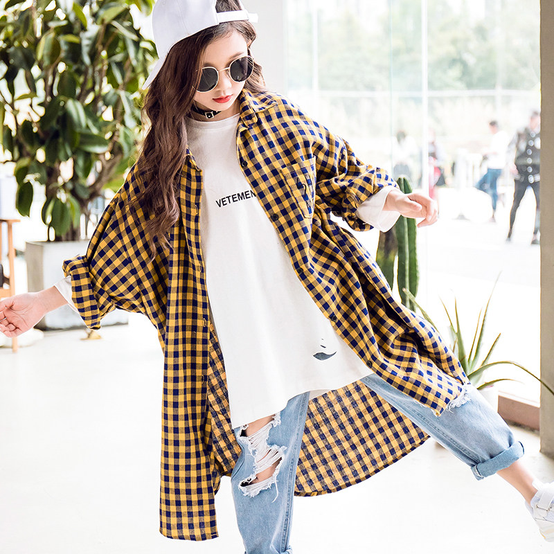 Girls shirt long-sleeved spring and autumn 2022 new Korean version of the big children's foreign style loose long plaid shirt girl trendy