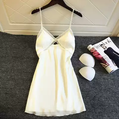 Real shot new sexy silk pajamas women's belt chest mat gathered hot lace sling nightgown night charm home