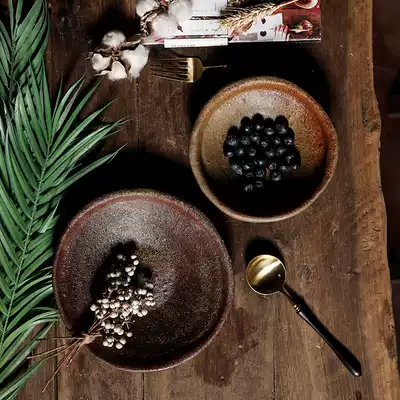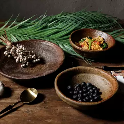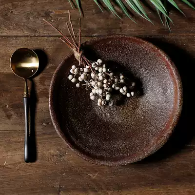 Light luxury rough pottery Brown cuisine fruit plate handmade retro ceramic plain and style Chinese style Japanese tableware ancient style Bowl