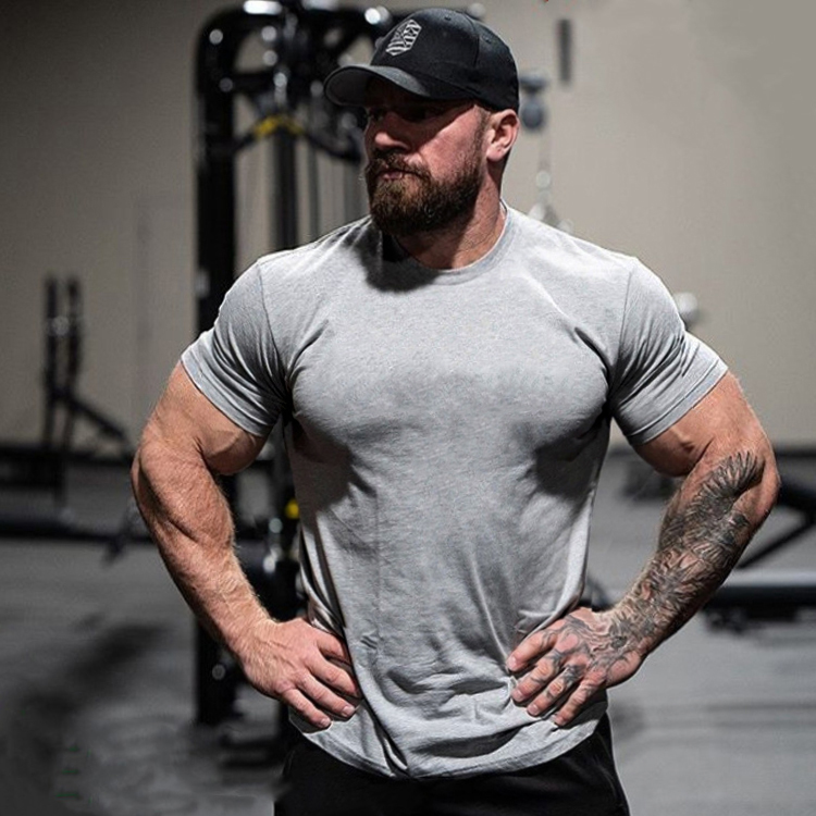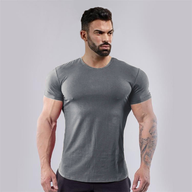 Musculature Male Cotton Stretch Short Sleeve Men Summer Pure Color Sport T-Shirt Custom Pattern Fitness Suction Sweaty Round Collar T-shirt
