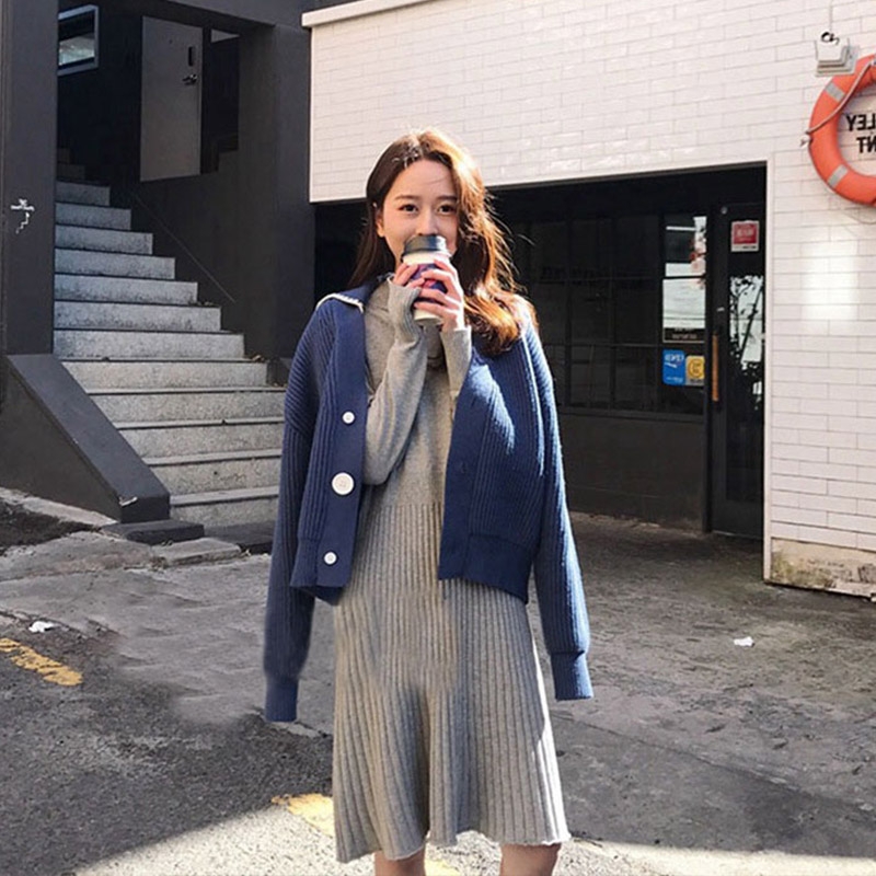 European station 2022 autumn new knitted dress suit net red lazy wind sweater cardigan with two-piece suit