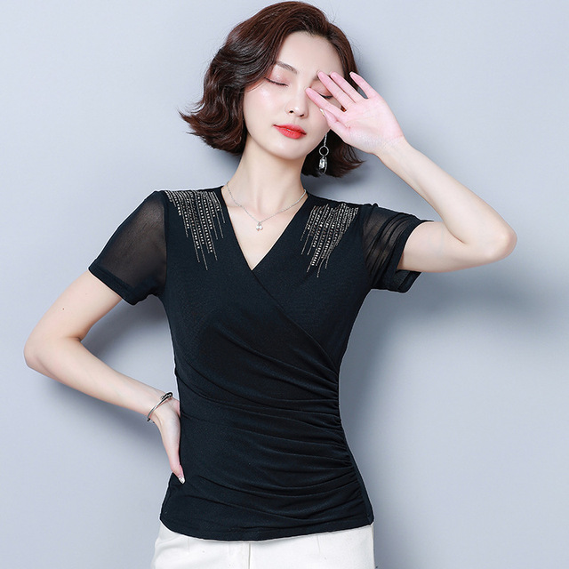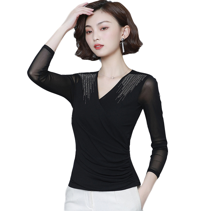 New elastic mesh yarn Morden dance blouse national standard dance practice long sleeve sexy cross V collar Skinny T-shirt
