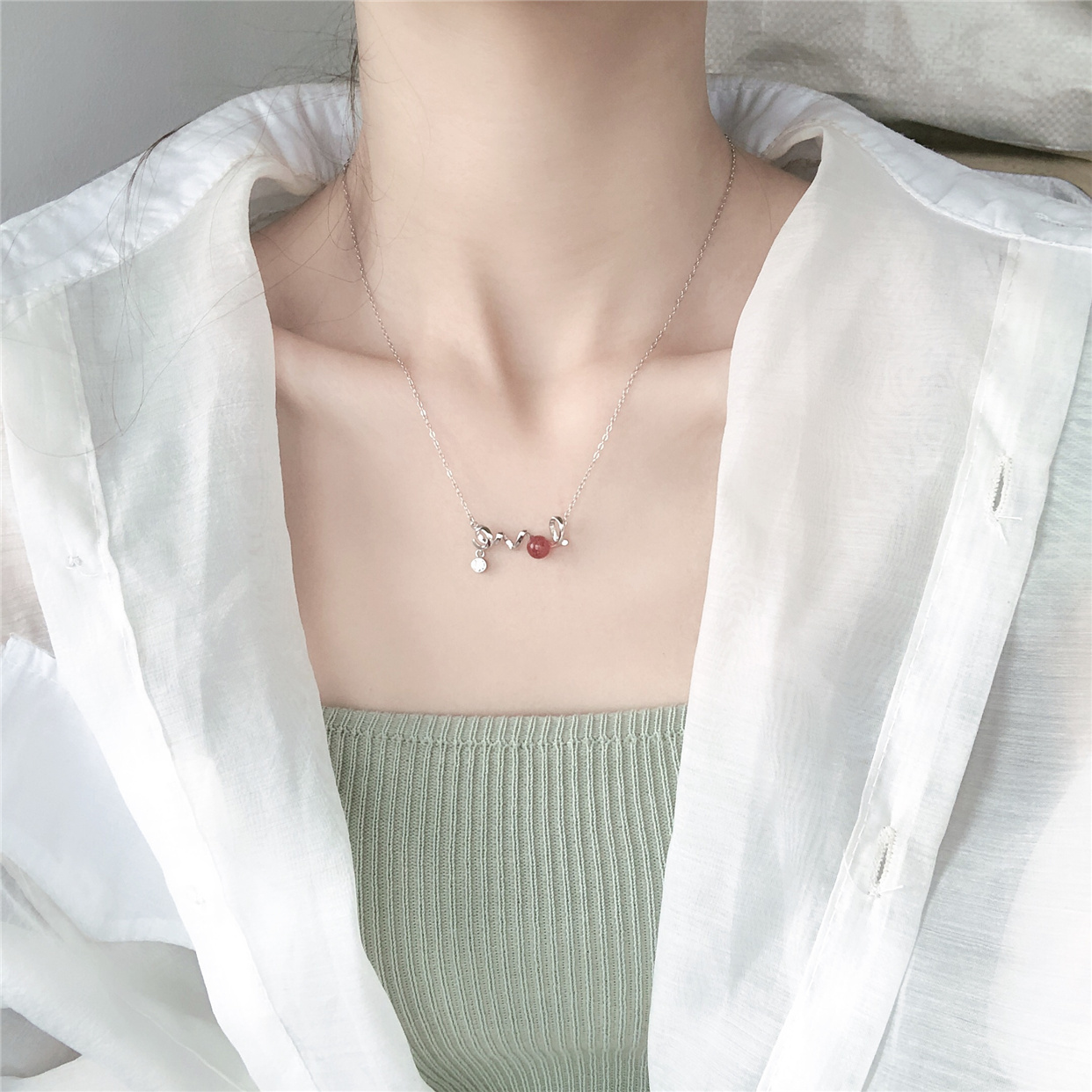 Natural strawberry crystal powder Crystal necklace Women's peach flower transfer beads ins net red light luxury niche Sterling silver clavicle chain
