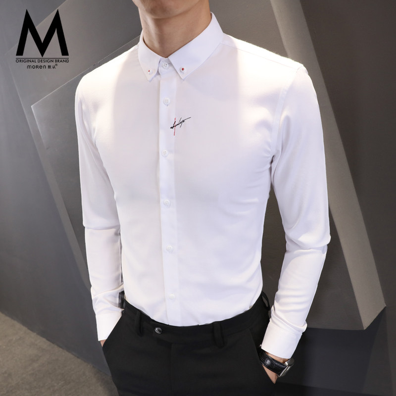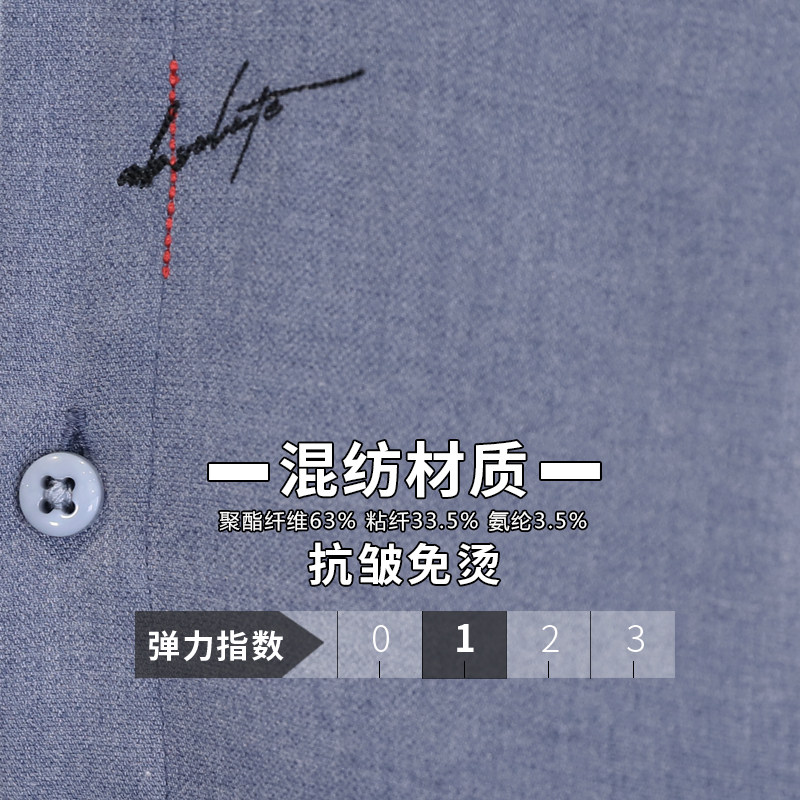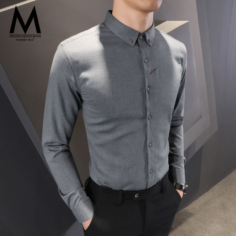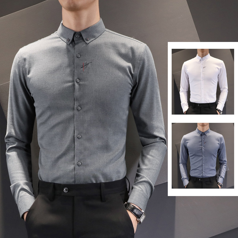 2020 spring new gray shirt men's long-sleeved embroidery inch shirt Korean version anti-wrinkle free ironing casual men's shirt tide