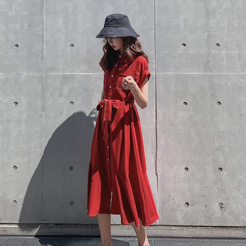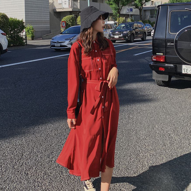 Pregnant woman red laced shirt dress in dress for spring and autumn fashion in a long version of a knee out of a long sleeve fishtail skirt