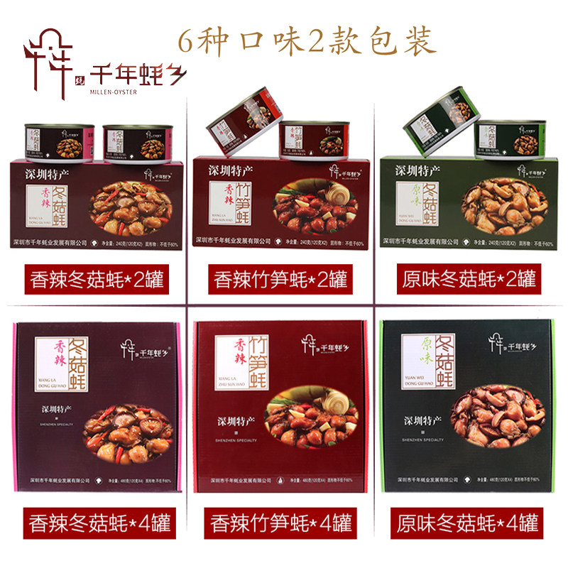 Original Shiitake Oyster 240g (two cans) Spicy Oyster oyster 240g (two cans) Spicy Bamboo Shoot Oyster 240g (two cans) Original Shiitake Oyster 480g (four cans) Spicy Shiitake Oyster 480g (four cans) Spicy Bamboo Shoot Oyster oyster 480g (four cans) Shenzhen Specialty Oyster Lucky Pack 612g + Gift Bag Super Value Savings - Spicy Winter Mushroom Oyster 108g (Bag) Super Value - Original Winter Mushroom Oyster 108g (Bag) Canned Ivy Mushroom Oyster 220g (two cans)