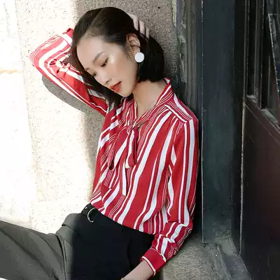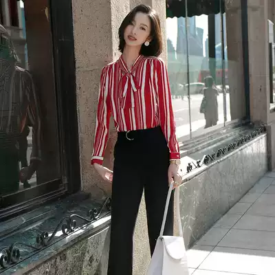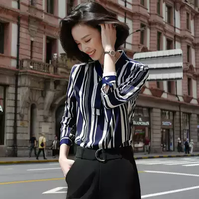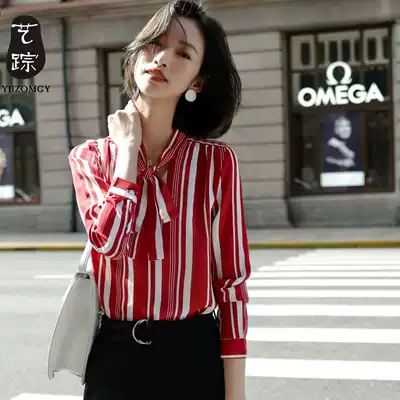 Vertical stripe chiffon shirt women long sleeve professional 2020 Autumn New bow blue shirt Women's temperament loose
