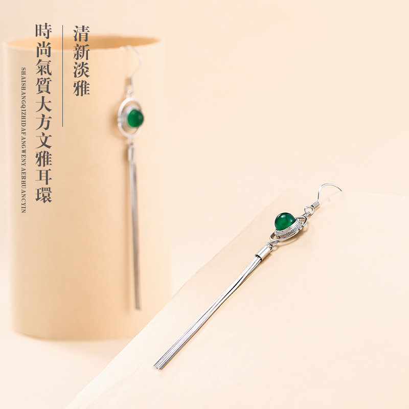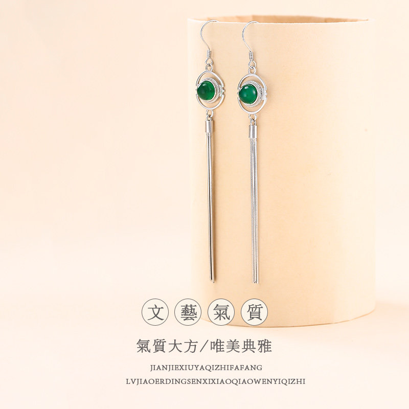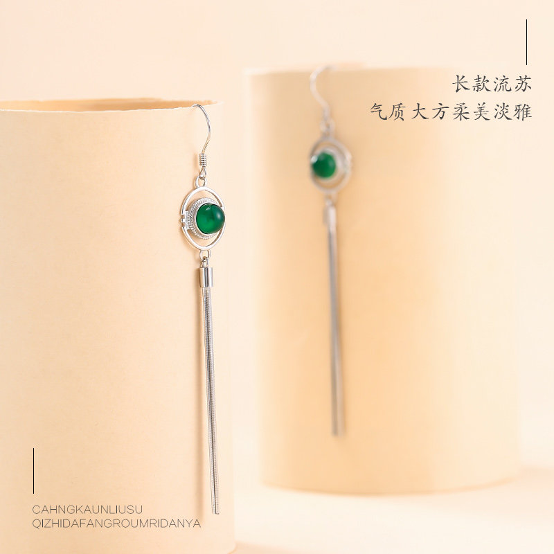 s925 pure silver green agate with Korean temperament Korean temperament Long version earbuds personality jade medullary earrings female net red flow su-ear necklace