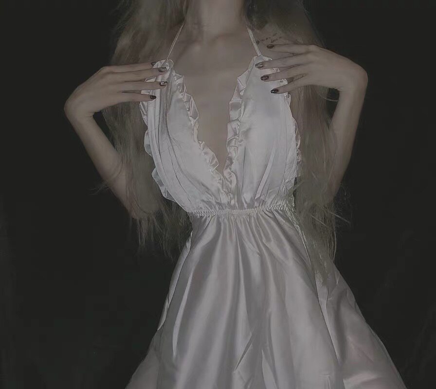 Cream satin fungus sling sexy pajamas sweet backless strap V-neck sexy nightdress (send stockings